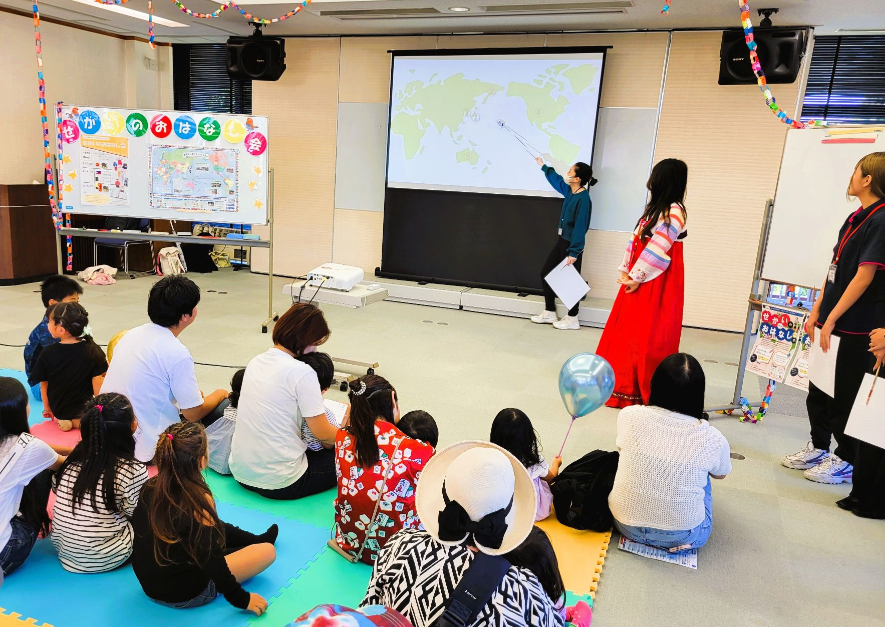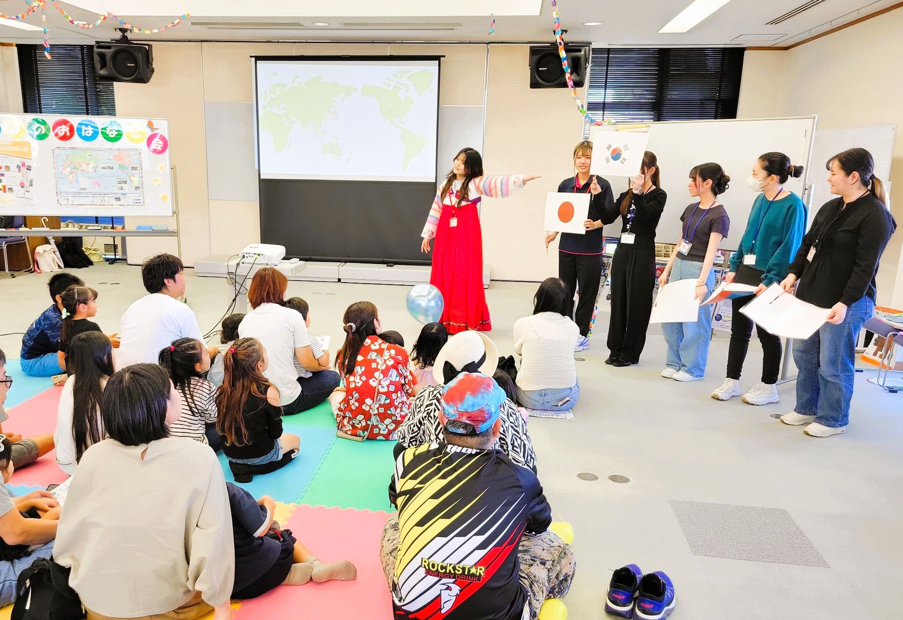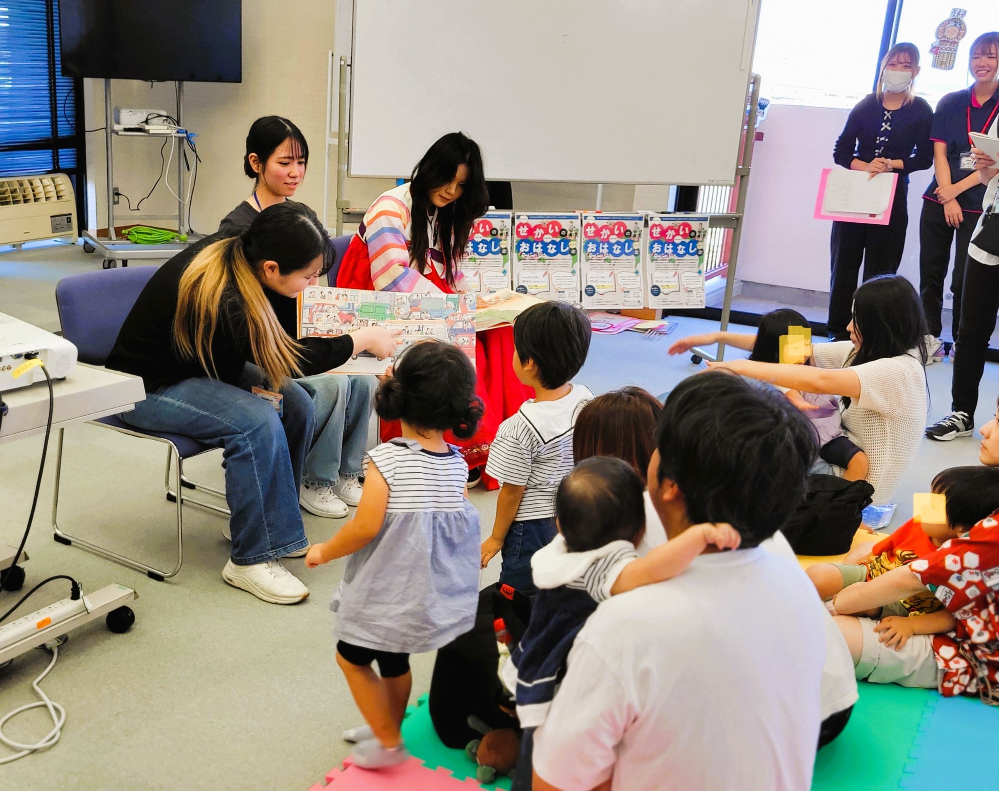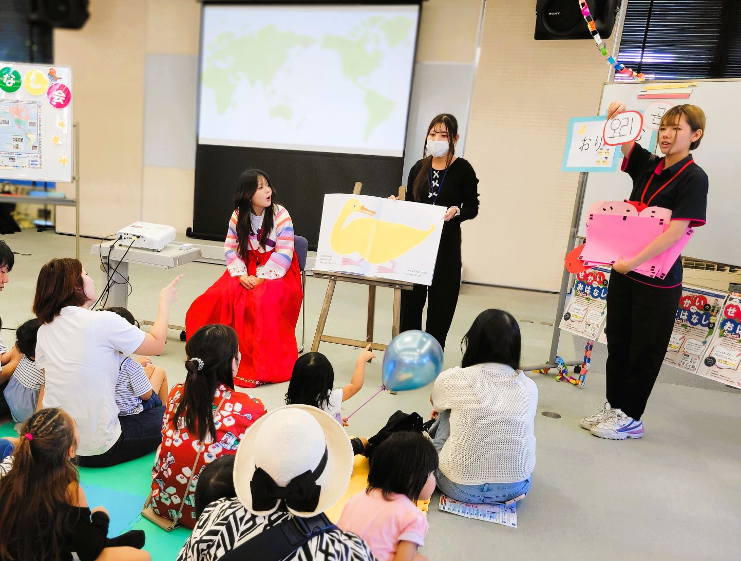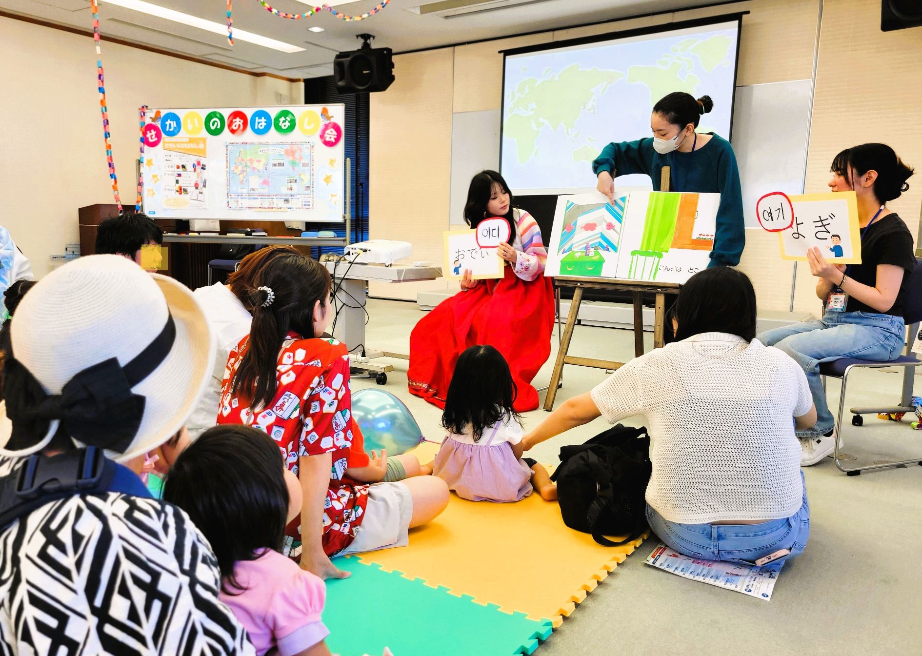 午前中に開催された「韓国編」では、韓国から来た県費留学生のユナさんと一緒に、3冊の絵本をつかって子どもたちやお父さん、お母さんたちとクイズやアトラクションで楽しく遊びました。
