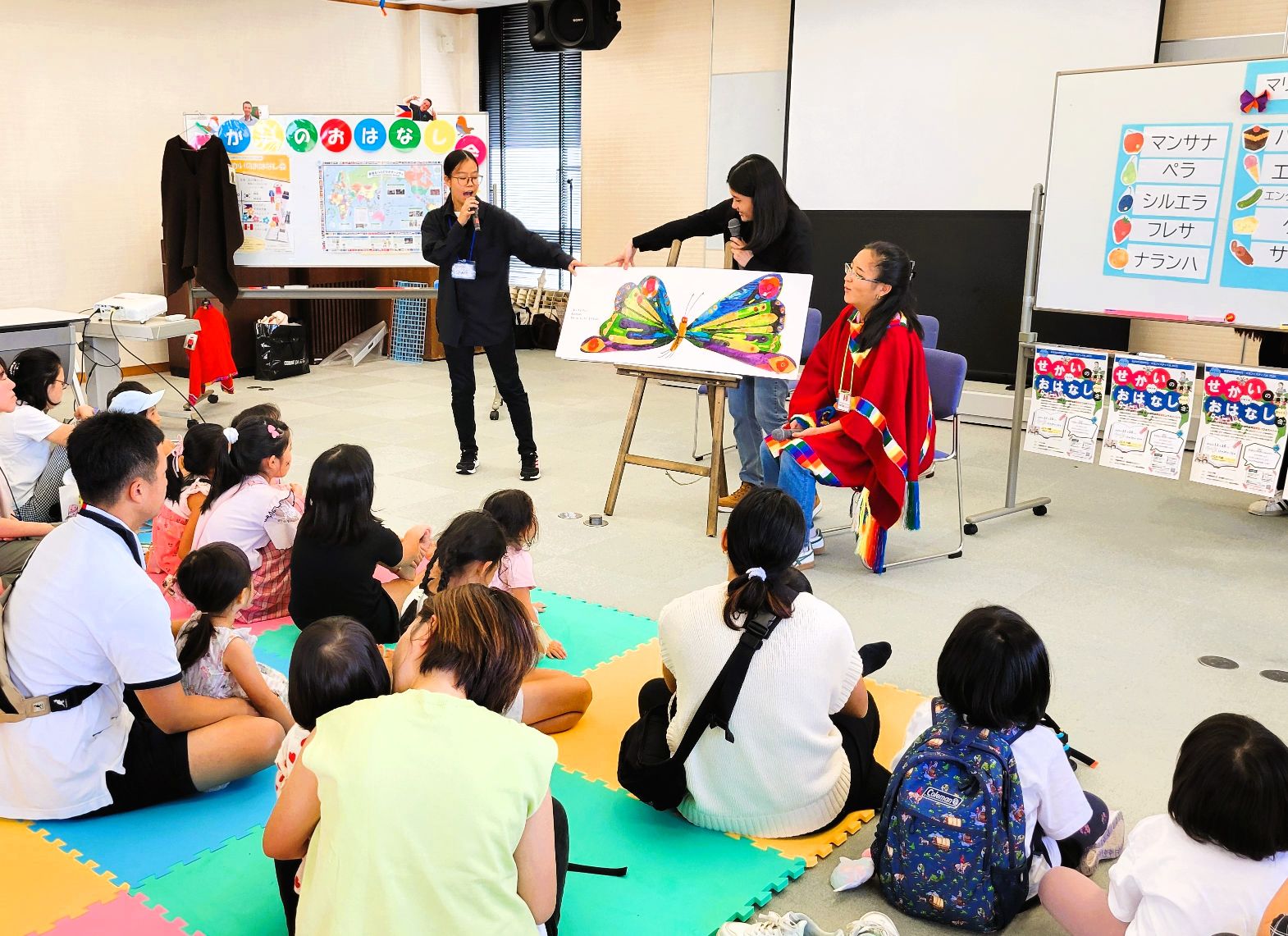 午後3時30分から開催された「ペルー編」では、ペルーから来た県費留学生のバネッサさん、よしあきさんと一緒に、「わけあう つながる せかいのえほん」というタイトルで、3冊の絵本をつかったおはなし会を行いました。