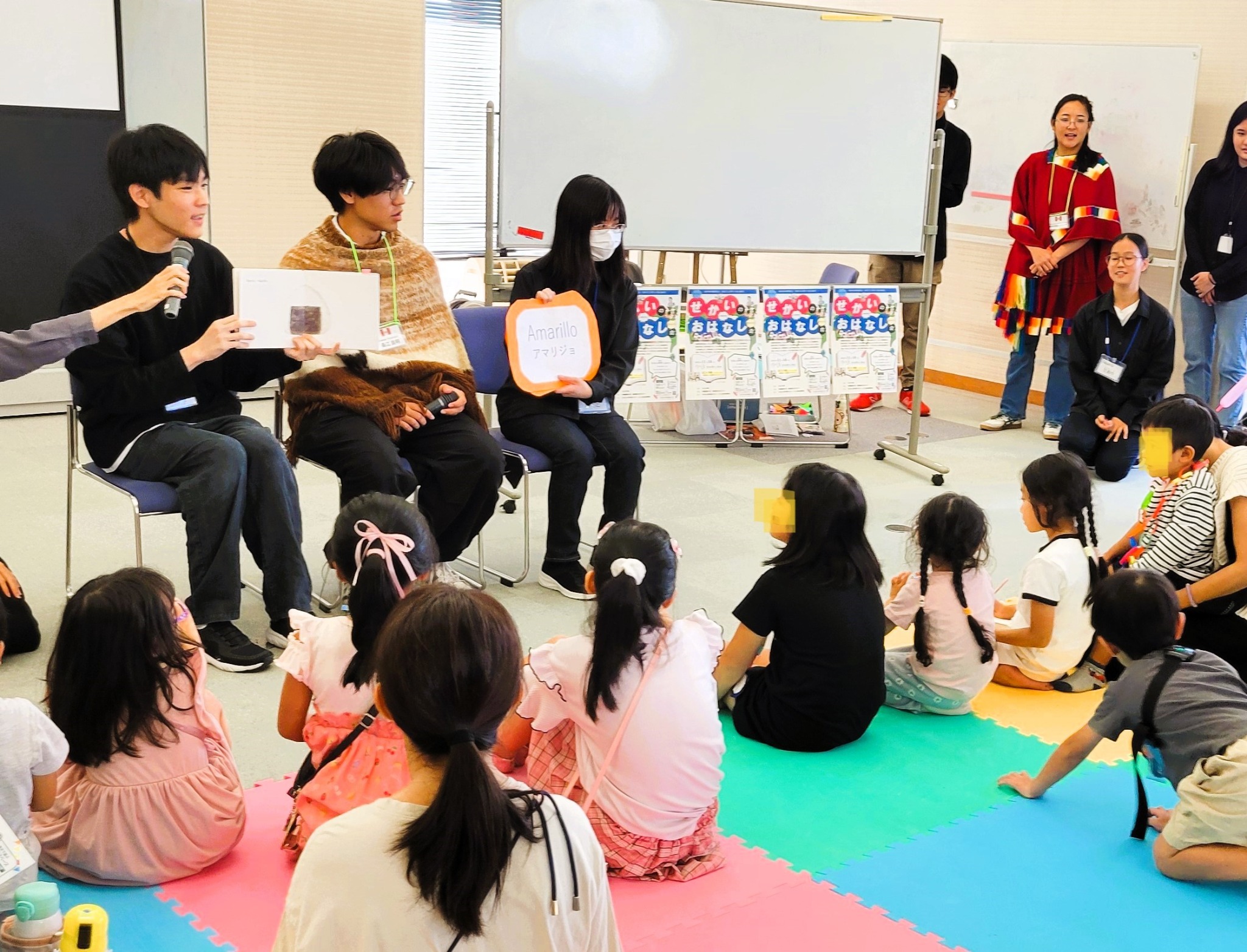 3冊目はふたたびみんなで楽しめる絵本として、『はんぶんこ』という絵本をつかった読み聞かせを行いました。この絵本は、「ドーナツ」「さつまいも」「おまんじゅう」「おにぎり」などをどんどん半分こしていくシンプルな絵本です。半分こしたときに出てくる、断面の色や食材などをスペイン語でよしあきさんに教えてもらいながら、おはなしを進めました。最後に進行の学生から、「みんなもこの絵本のように、おいしいものを誰かとはんぶんこするような優しい気持ちをもってくださいね」と、国際交流の大切さをわかりやすく伝えました。