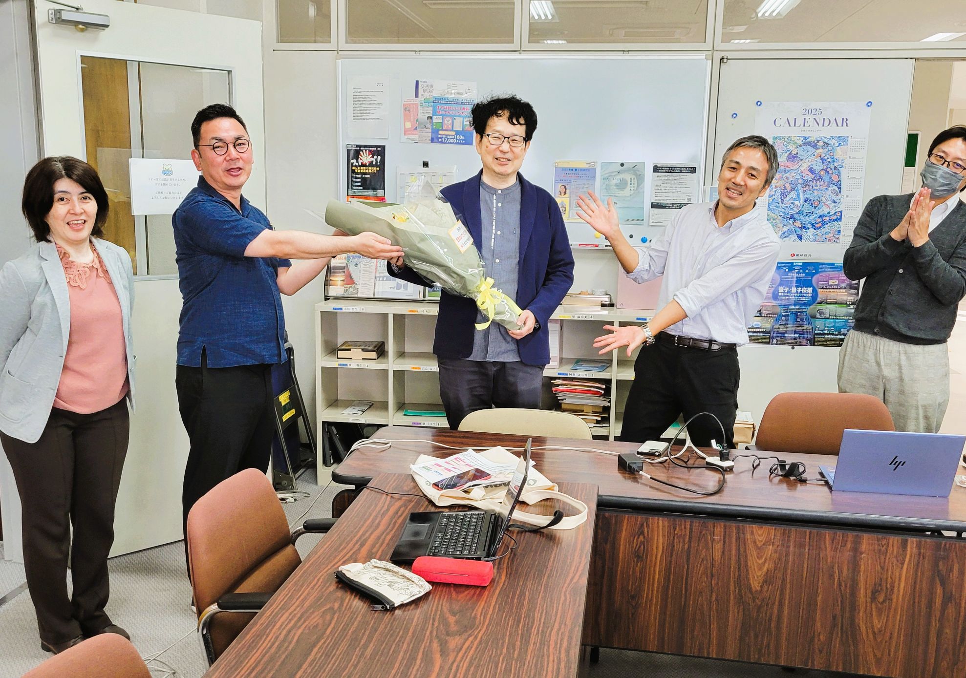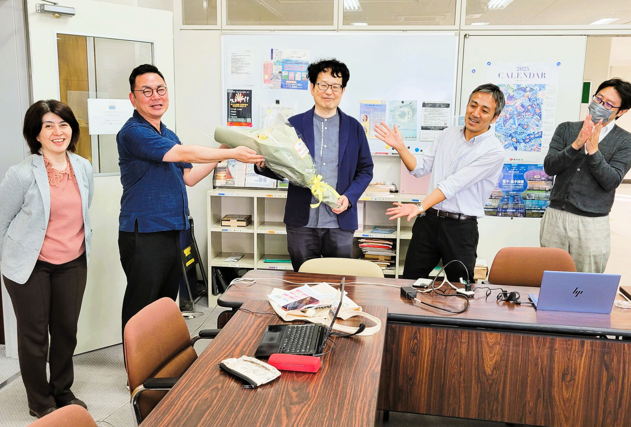 この日は学科の先生たちが集まって、西岡先生にお祝いのお花をプレゼントしました。