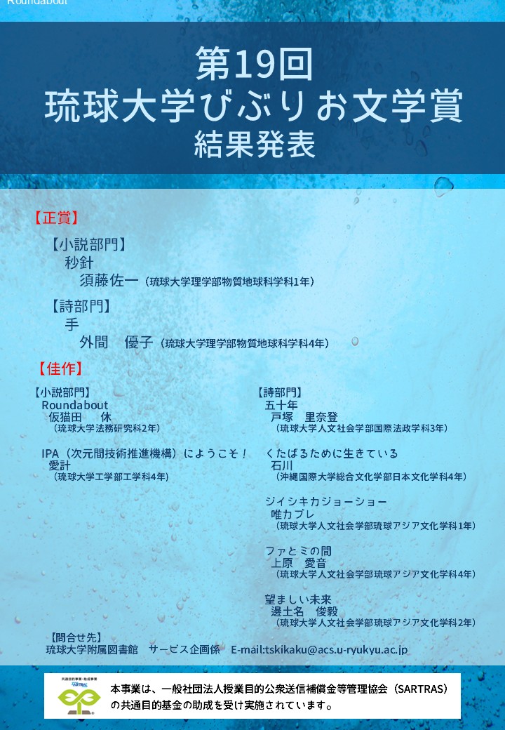 日本文化学科で現代文学の授業を担当している村上陽子先生が審査員の一人を務めている「第19回琉球大学びぶりお文学賞」の選考結果が発表され、詩部門佳作を日本文化学科4年生の石川さん(ペンネーム)が受賞しました!