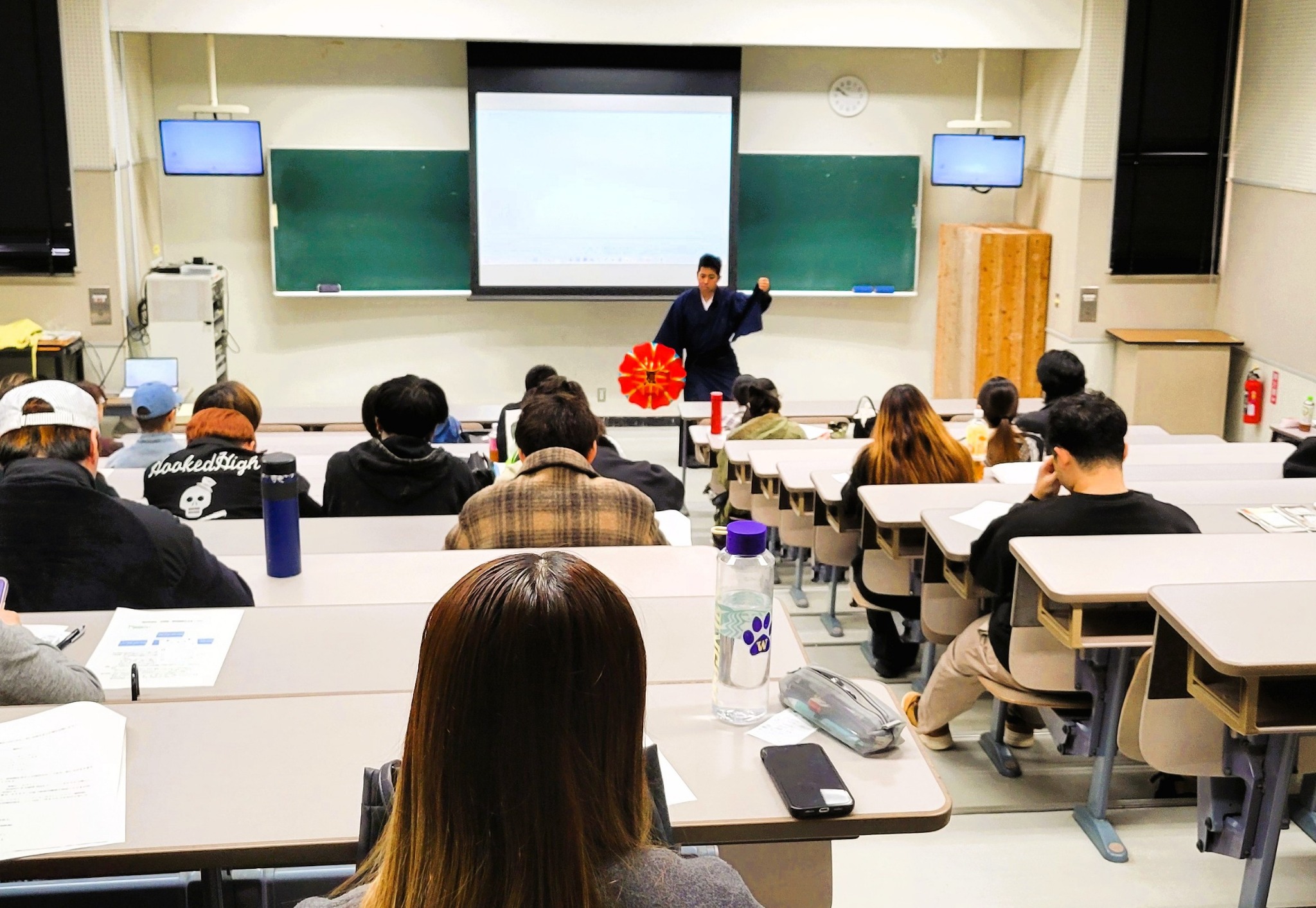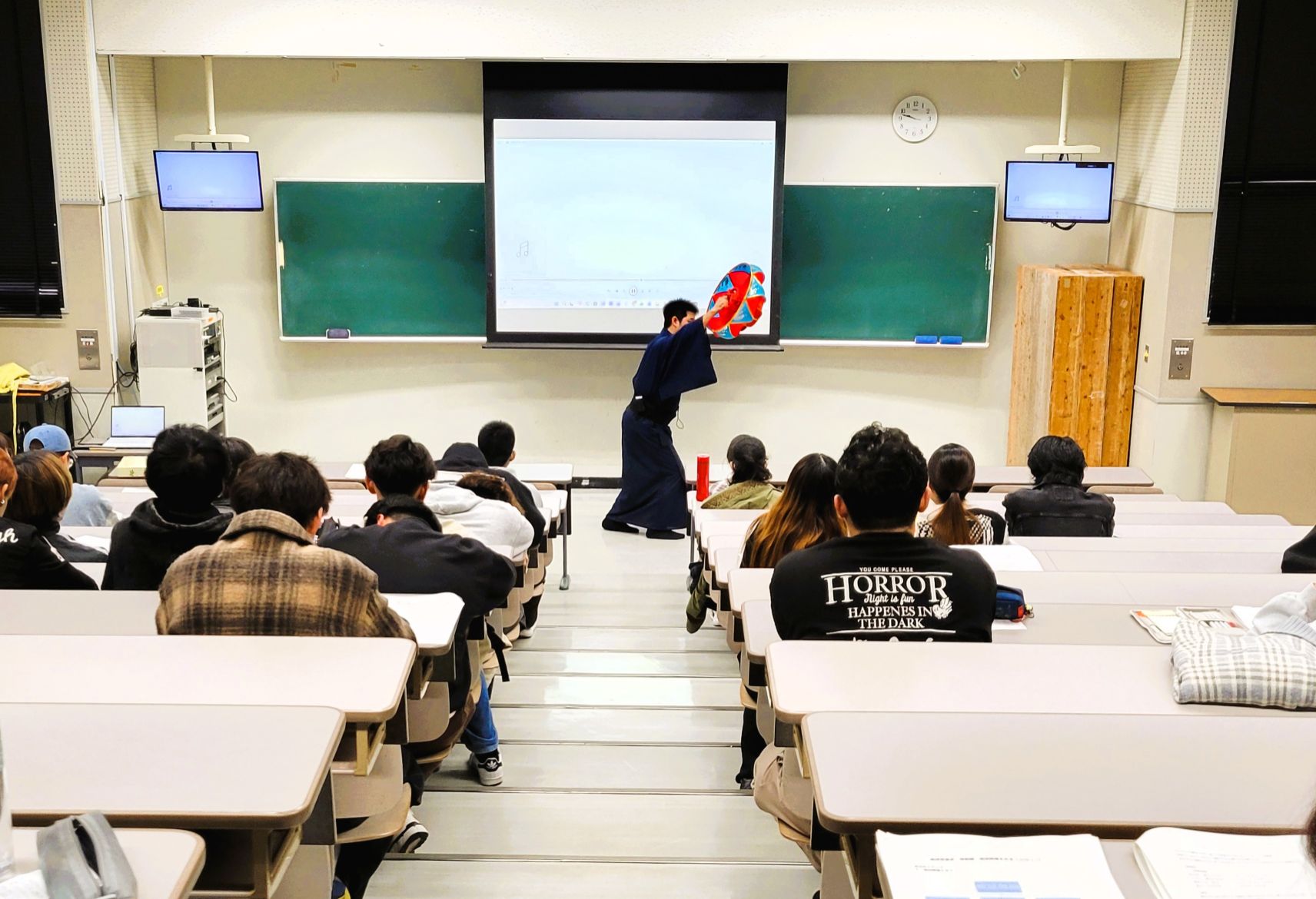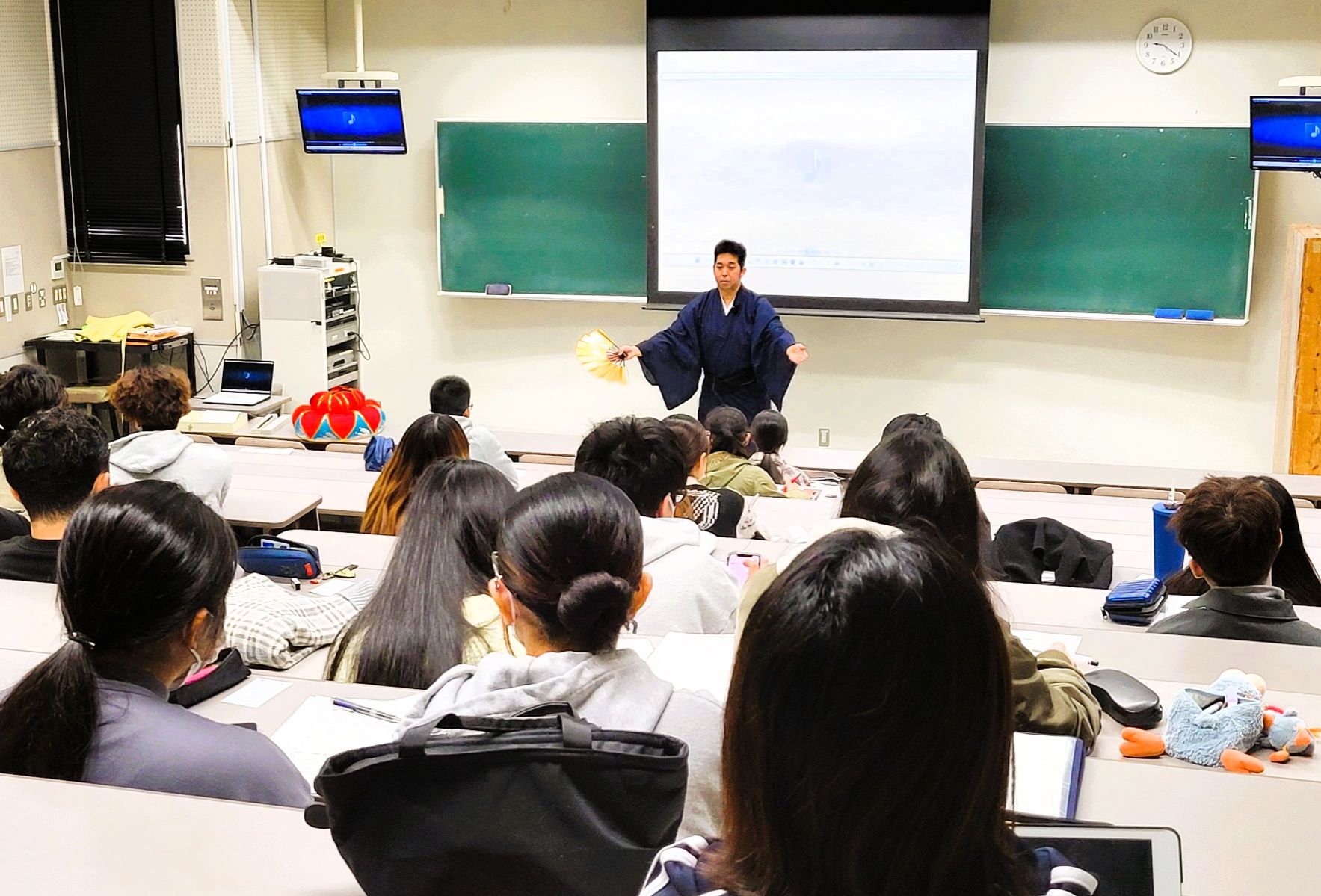 2年生が多く受講する「琉球芸能史」という授業では、1月7日の1時間目を「新春特別編」として、我部大和先生が素踊り(化粧なし・稽古着)で、古典舞踊「かぎやで風」と「伊野波節」、さらに「揚作田」の3演目を披露しました。