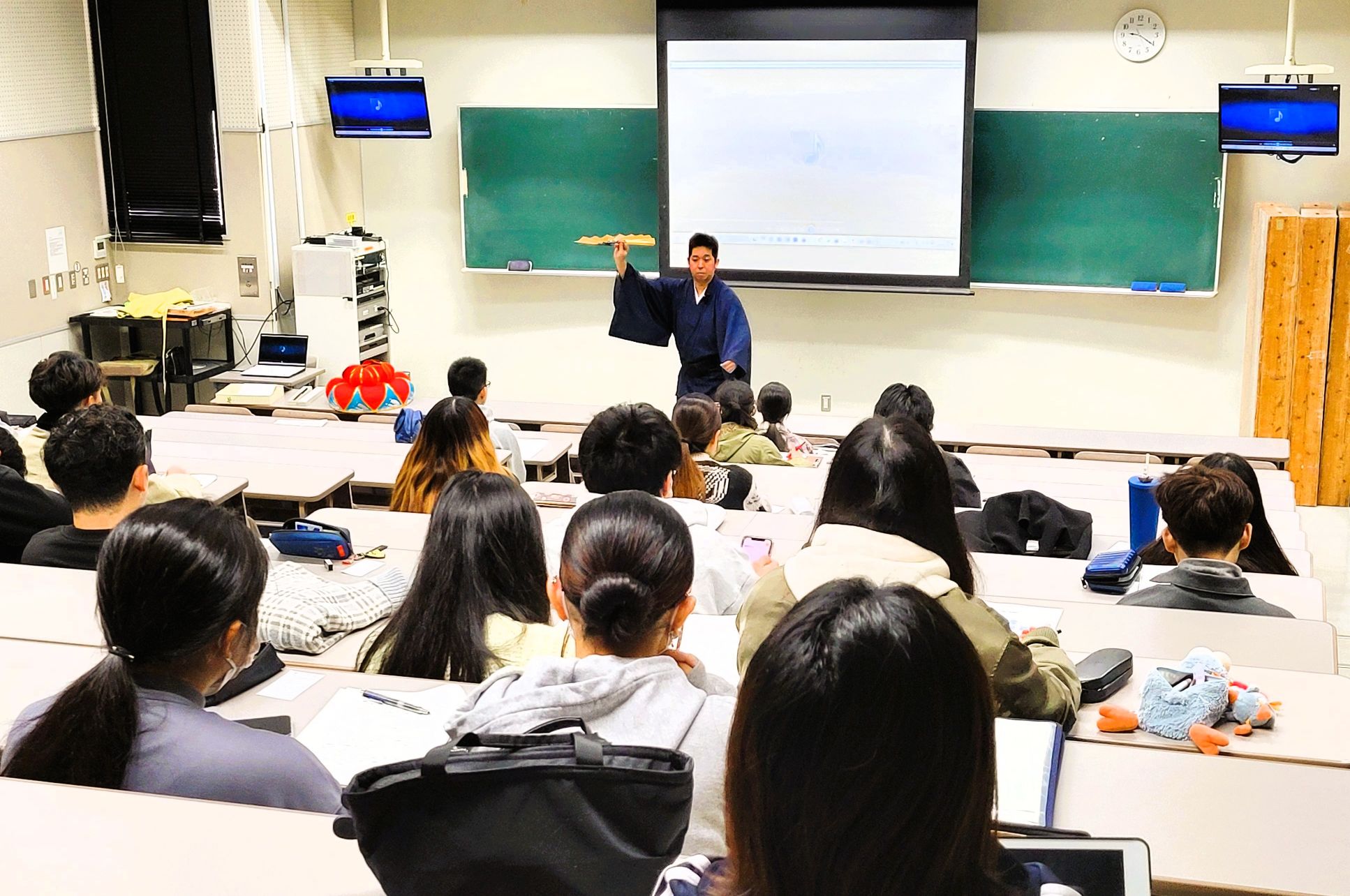 我部先生が中心となって運営している「琉球沖縄文化コース」の授業では、琉球文学の理論をただ学ぶだけでなく、見て、聴いて、体験的に理解することができるようになっています。