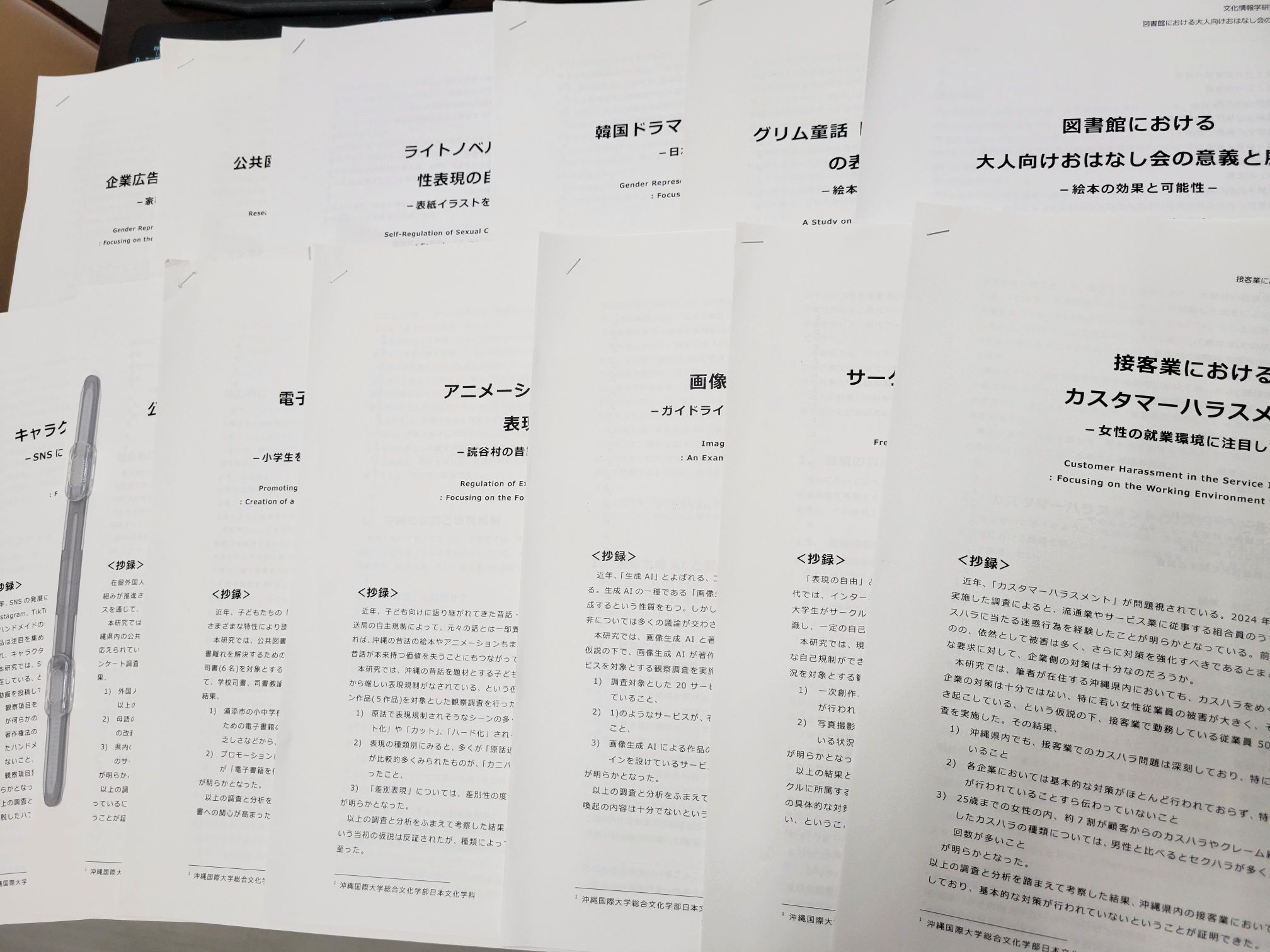 日本文化学科では卒業論文の執筆が全研究室で必修となっており、日本語学・言語学、国語教育学、日本文学、琉球語学、琉球文学、古典芸能、日本語教育学、サブカルチャー論(アニメ・マンガ・映画・音楽など)、多文化間コミュニケーション論、図書館情報学、文化情報学、出版流通問題などなど、専門科目で学ぶ知識を土台として、各自が様々な興味関心に応じて自由にテーマ・題材を設定し、仮説を立て、インタビューやアンケート、観察・実験等を通してそれを検証し、分析していくスタイルで行われています。卒論の分量は人それぞれですが、多い人は原稿用紙で100~200枚以上になることもあります。