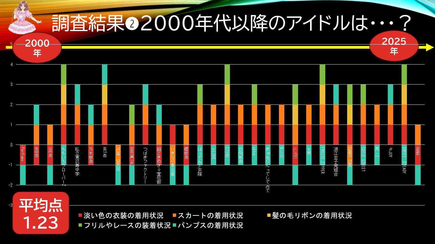淡い色、スカート、リボン、フリル・レース、パンプスといった女の子らしいアイテムが衣装にみられたら1点、反対に、黒っぽい色、ズボン、ブーツといった男性らしいアイテムが衣装に見られた場合は―1点、というように点数化したところ、1980年代の女性アイドルの平均点は3点を超えましたが、2000年代以降の女性アイドルの平均点は1.23点となりました。興味深いのは、2000年代以降の女性アイドルも、リボンなどのかわいい要素を持つアイテムを使用していないわけではないのですが、部分的にズボンを着用したり、黒っぽい衣装を着用しており、女性らしさと男性らしさの両方が取り入れられたファッションが好まれている、ということです。ジェンダー平等の考え方が広がる中で、アイドルのデビュー曲衣装にも多様性が尊重されるようになっている、という結論が報告され、会場からは驚きの声が聞こえてきました。