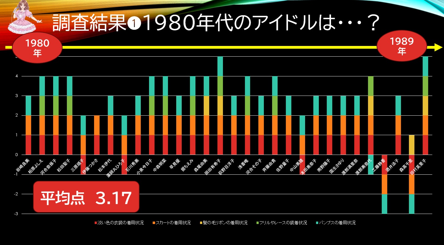 「1980 年代「女性アイドル」のデビュー曲「衣装」にみるジェンダー・バイアスの研究」は、「女の子らしさ」「かわいらしさ」というジェンダーバイアスが、1980年代の女性アイドルには顕著にみられるが、2000年代以降、ジェンダー平等の考えが広がる中で徐々に解消されてきているのではないか、という仮説を検証するため、YOUTUBEなどの動画を視聴して、そのデビュー曲の衣装にみるかわいらしさがどのように変化しているかを調査、分析したレポートです。