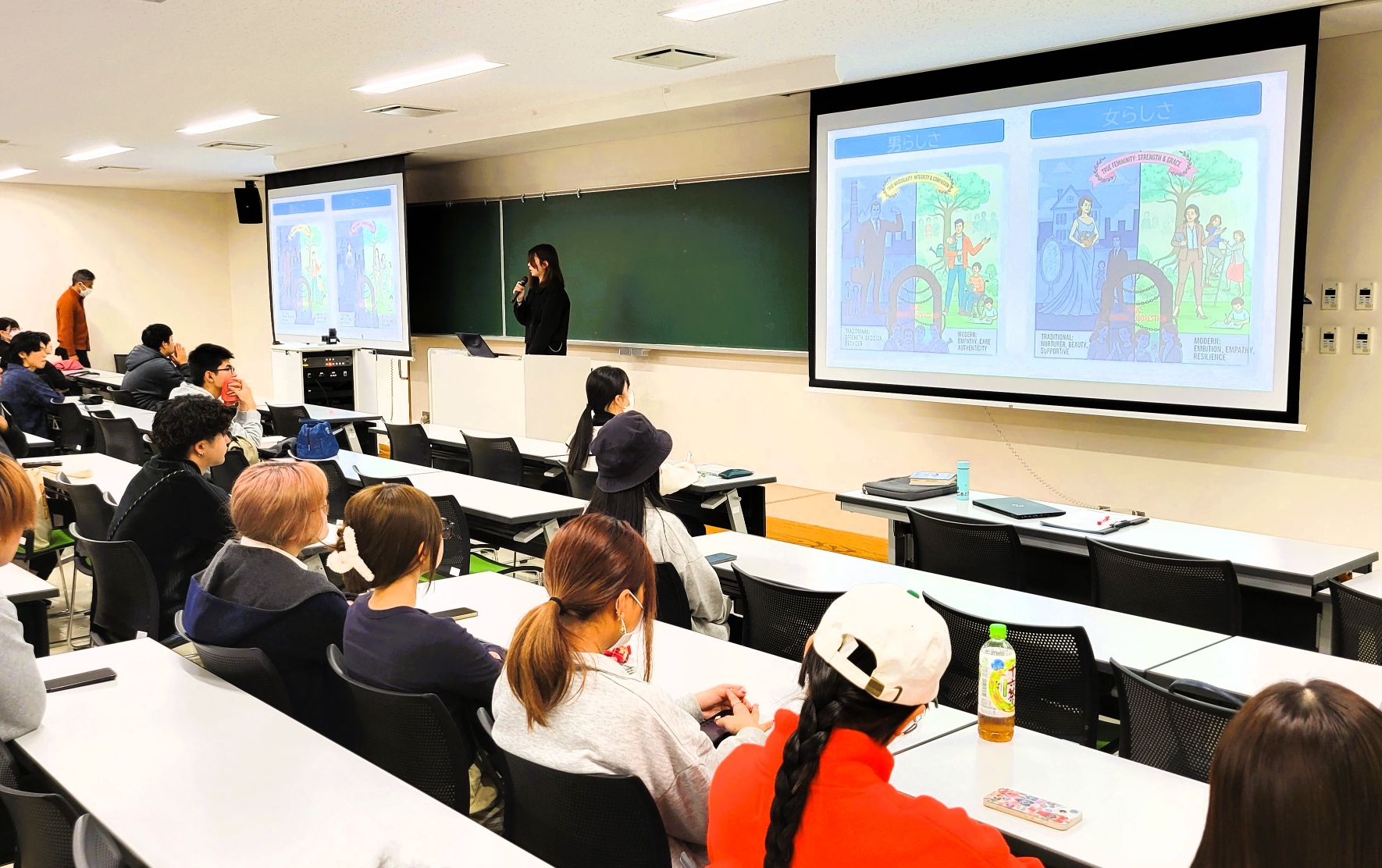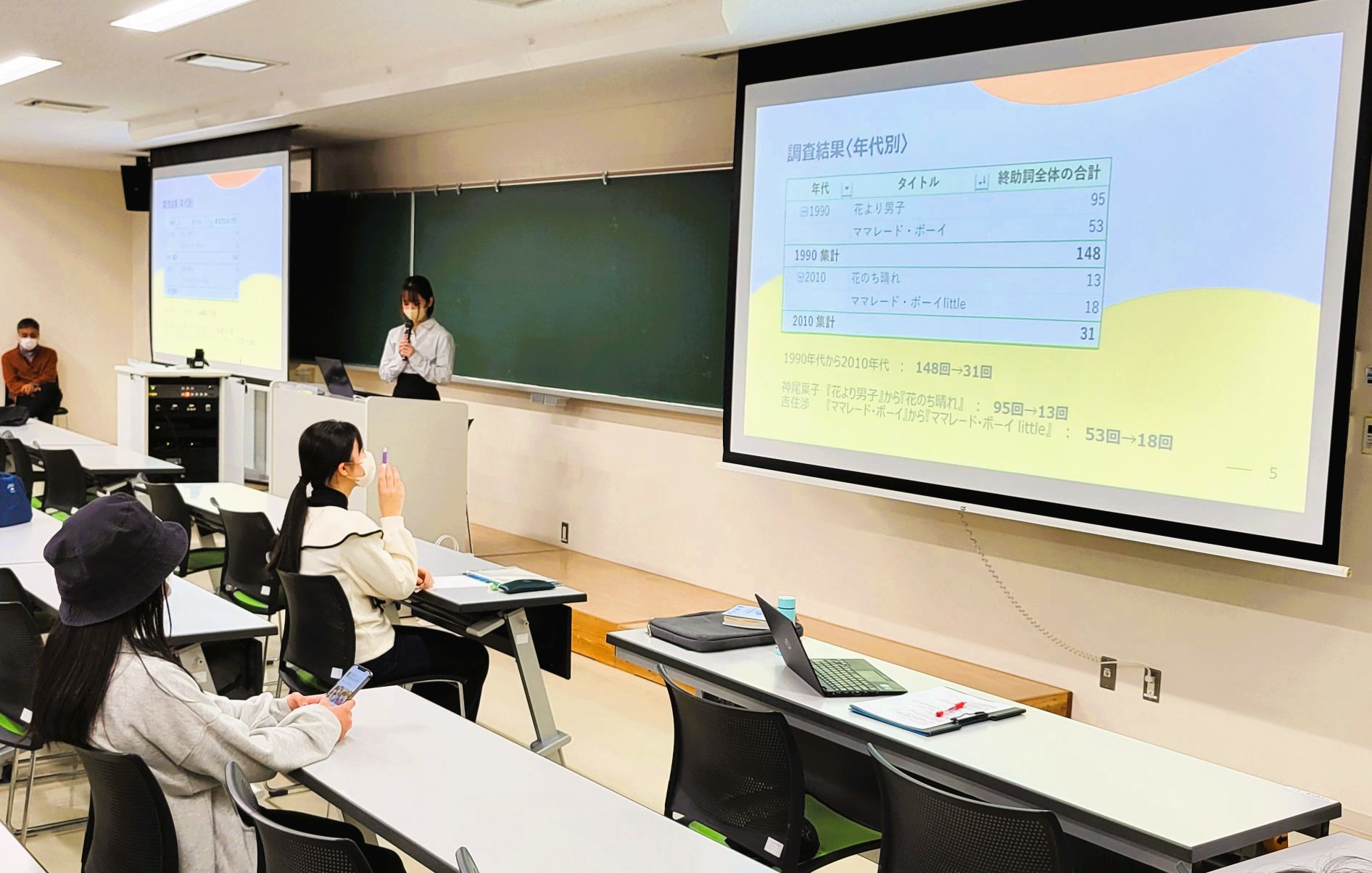 日本文化学科では、2年生必修科目として前期に開講されている「アカデミック・ライティング」において、3年生から本格的にスタートする卒業論文を書くためのレッスンとして、学術論文のテクニック、先行研究の調べ方・引用方法、テーマの決定方法、分析方法などを、ライティングセンターによるサポートも受けながら学んでいきます。そして、夏休みの課題として、日本文化学科の専門領域である文学や言語学などをテーマとする論文執筆を全員に課し、各クラスごとに優秀レポートを選出し、その報告会・授賞式を、2年生後期必修科目である「ゼミナール入門」の中で行っています。