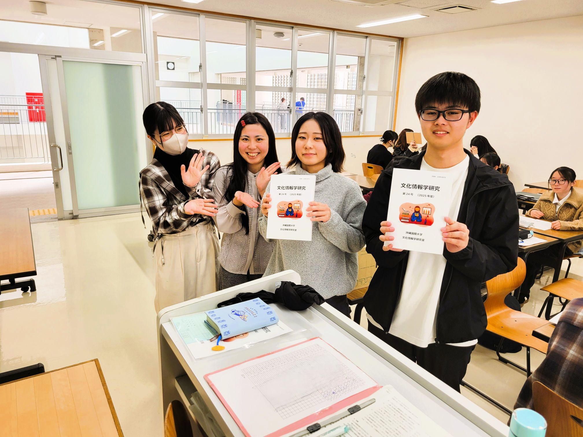 この日の報告会では、まず、4年生から3年生へ、2年間の研究活動の集大成である卒論集『文化情報学研究』第24号の贈呈式が行われました。
