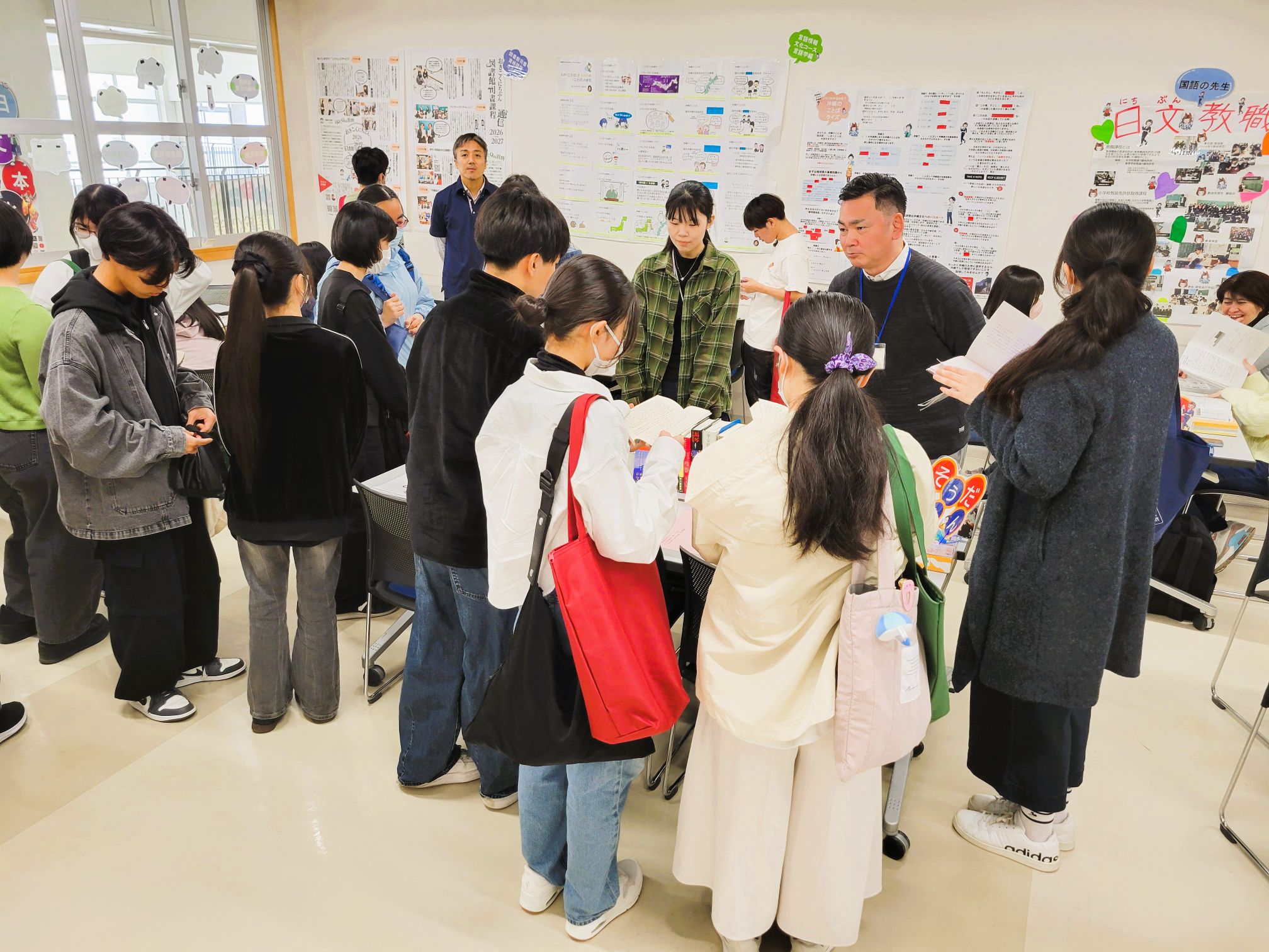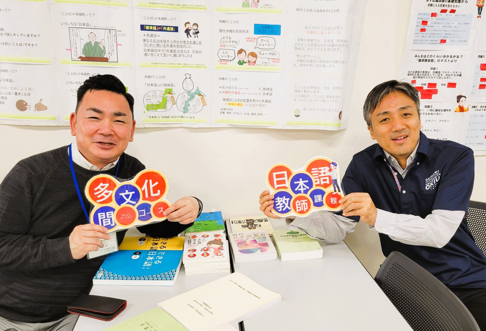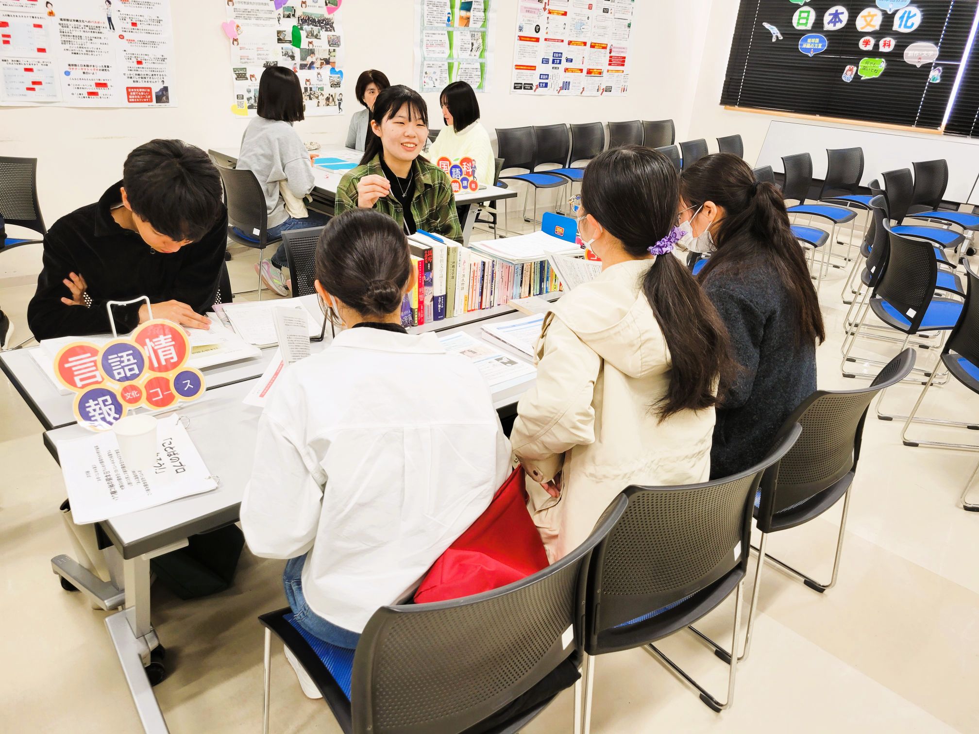 学科紹介の動画上映後は、国語科教員、日本語学、文学・創作、日本語教師、留学、図書館司書、琉球語・琉球芸能、といったテーマごとにブースを作り、卒論集を展示したり、学生たちが使っている教科書やノートなどをみてもらう時間をとりました。