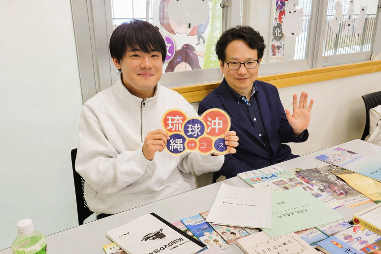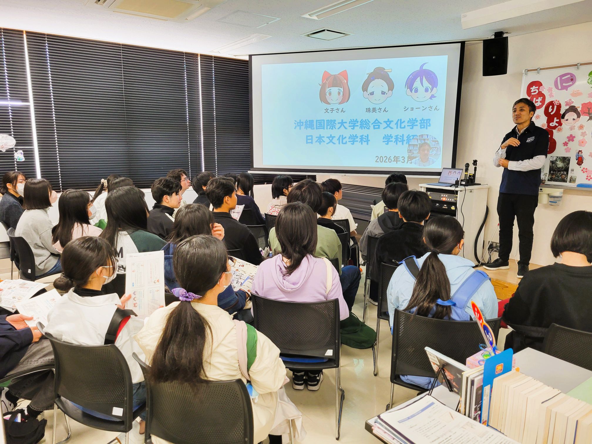 2026年3月14日、沖縄国際大学3号館503教室にて、新高校3年生・2年生向けの春のオープンキャンパスを開催し、日本文化学科の説明会場には、第一部、第二部、あわせて約50名の参加がありました。