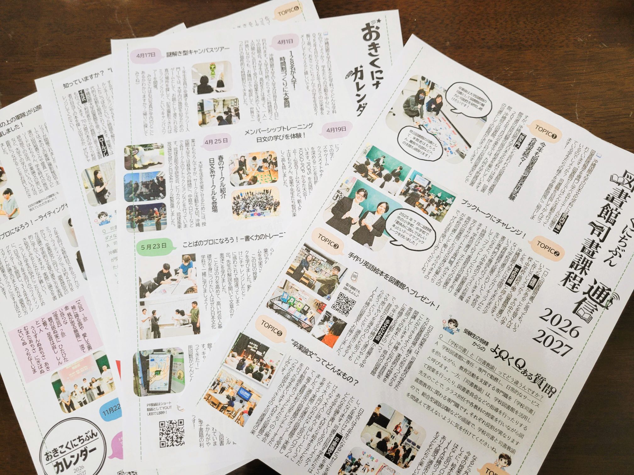 今回は初の試みとして、日本文化学科の1年の出来事をまとめた「おきこくにちぶんカレンダー」という、学級新聞風のチラシも作ってみました。2027年受験用のパンフレットの完成は6月ごろになるので、昨年のパンフレットをつくったあとの出来事を知ることができるようになっています。