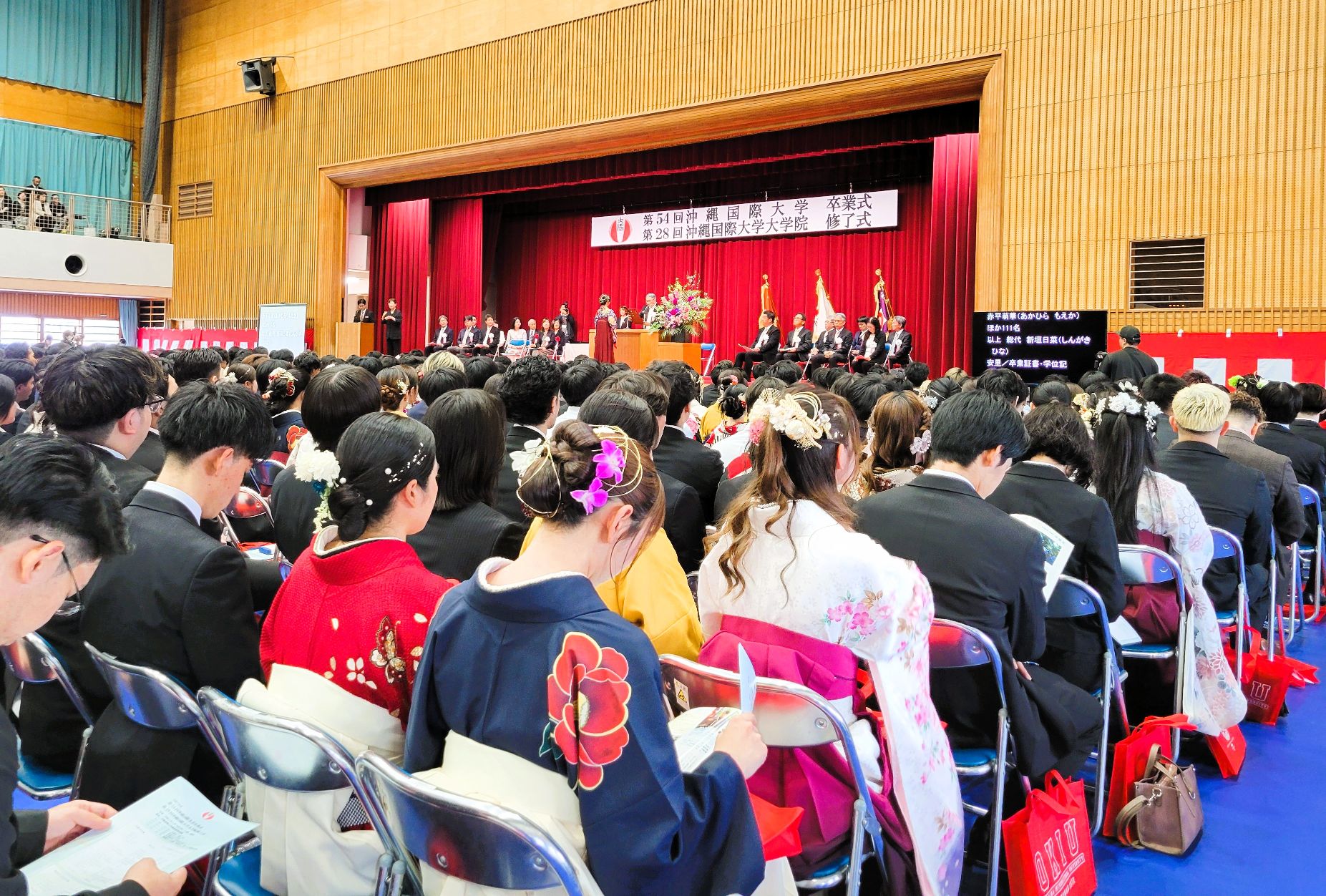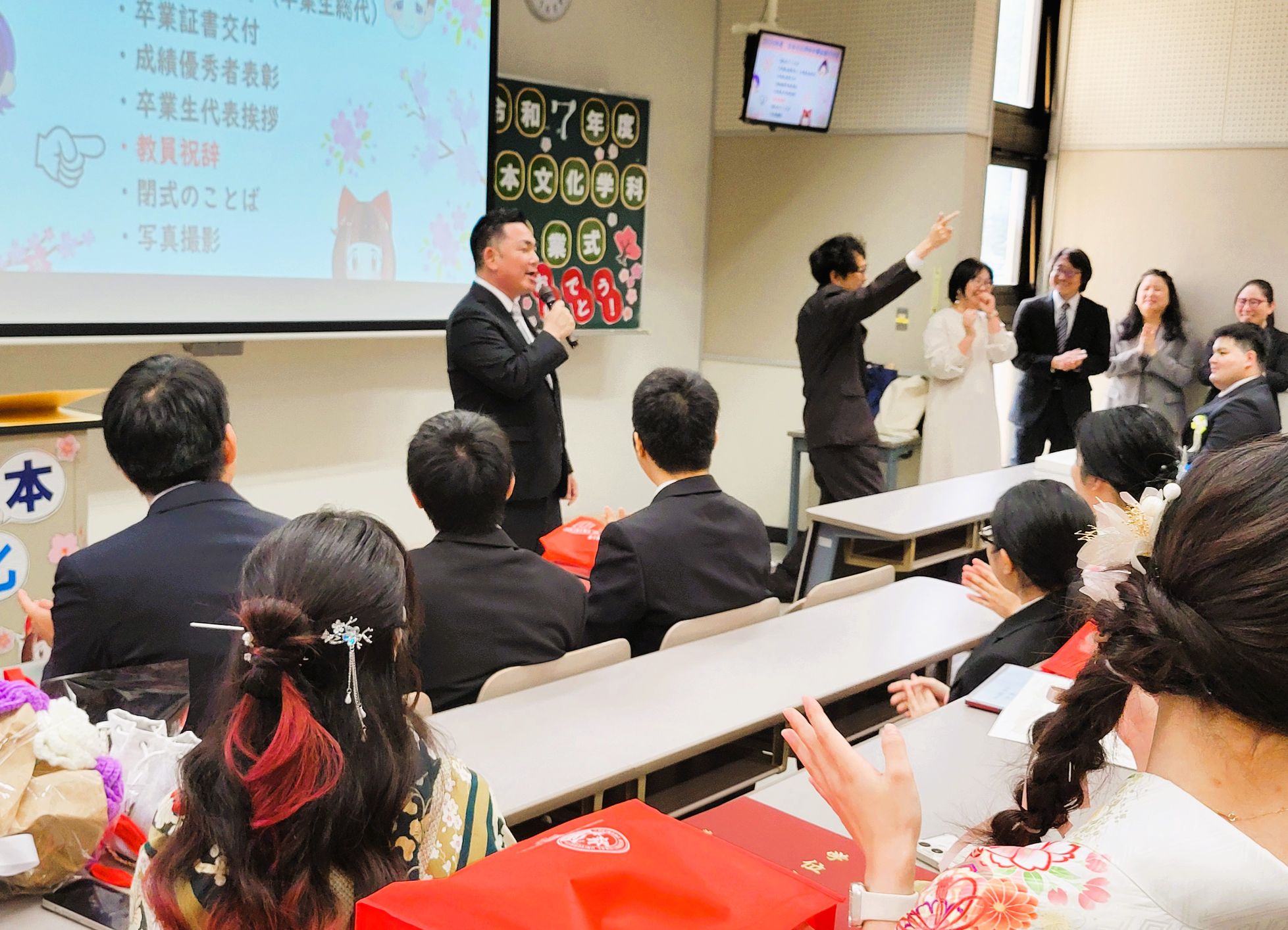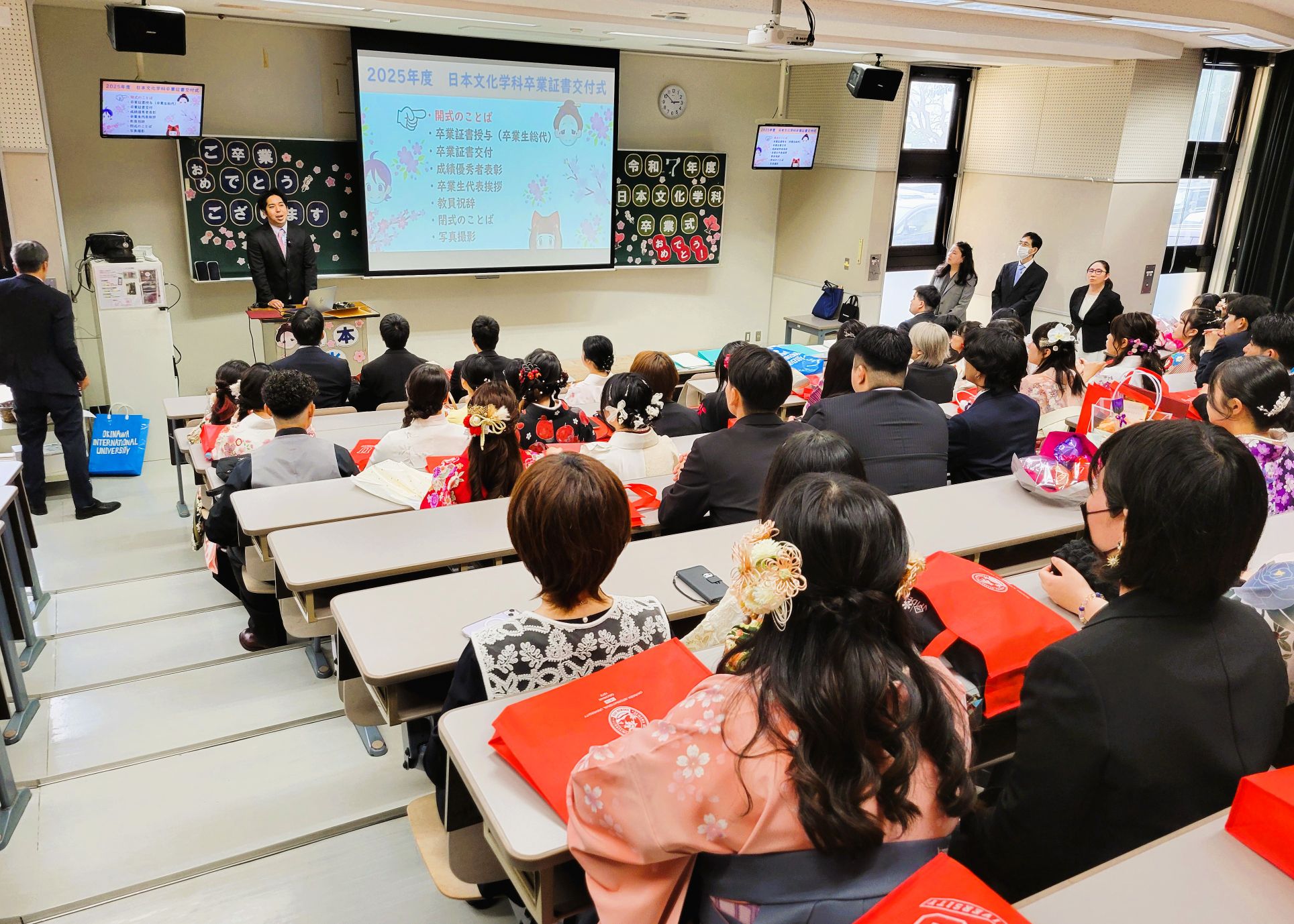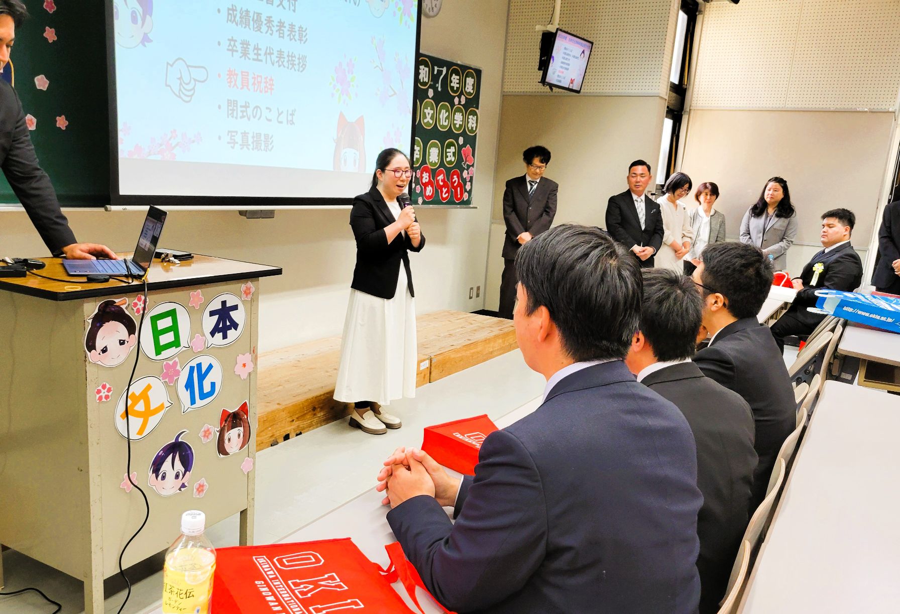 2025年3月19日、沖縄国際大学体育館兼講堂で卒業式が挙行され、式典終了後、5号館107教室にて、日本文化学科卒業証書授与式が開催されました。