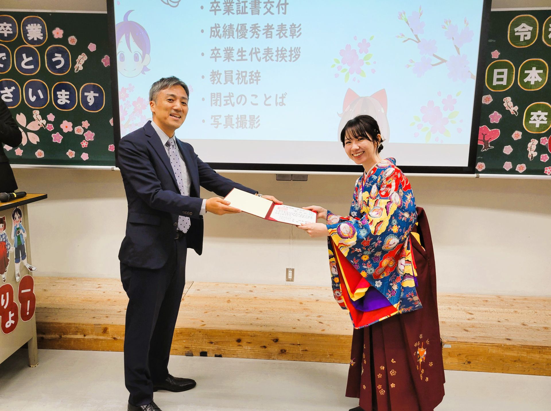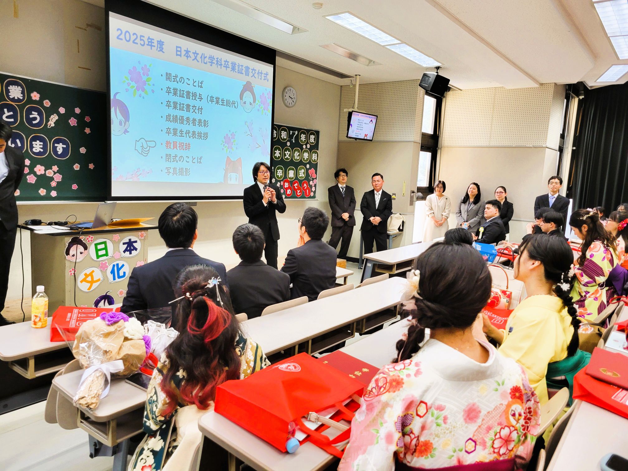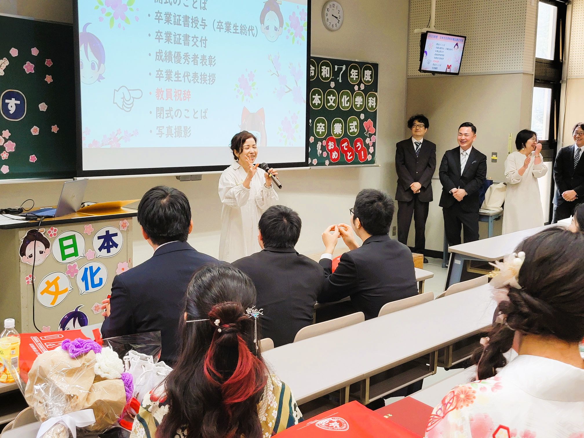 この授与式は日本文化学科の恒例行事で、先生たちの手作りの式です。