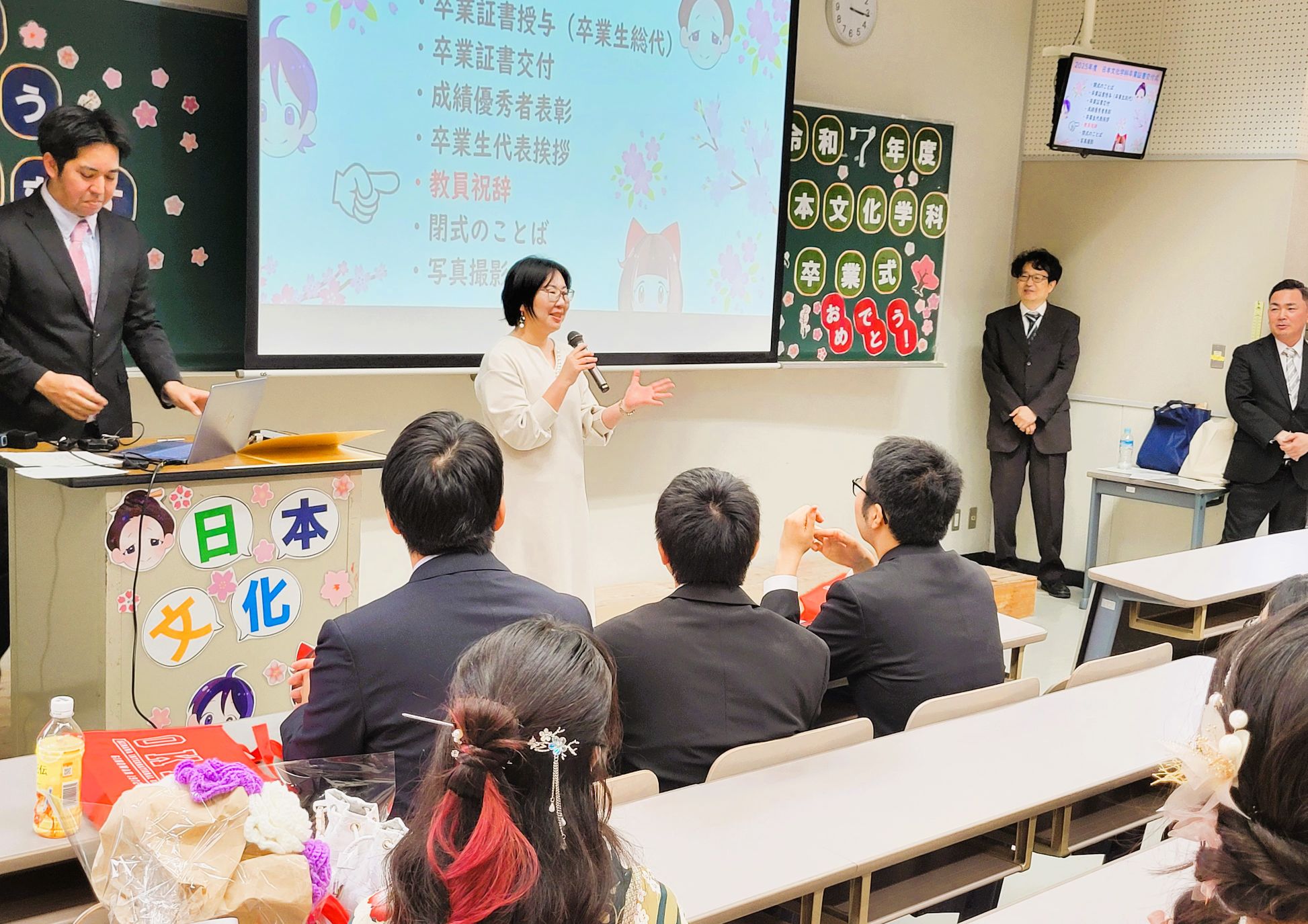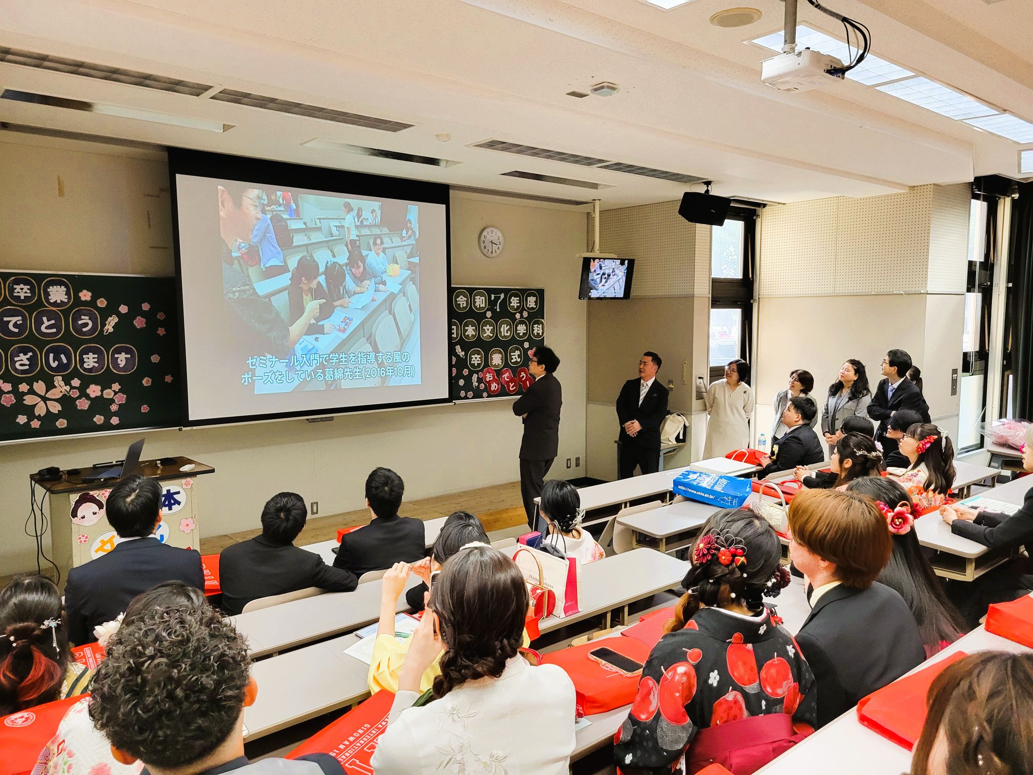 「みなさんが日本文化学科の授業やゼミの発表で身に付けた、情報を集める力、整理する力は、社会に出てもきっと役立つと思います。皆さんと一緒に私も卒業しますが、みなさんに負けないように私も頑張ります」と葛綿先生。