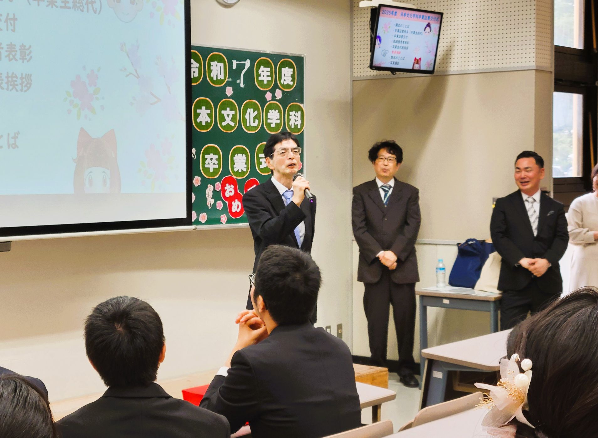 図書館学担当の名城先生は、「歌で盛り上がった後で挨拶がしづらいですが…」と前置きして、県外で働く人、離島で働く人など、卒業を機に生活環境が変わる人が多いと思いますが、新しい生活の中でもぜひ身近にある図書館を見つけて、読書を通して世界を広げてください」というメッセージもありました。