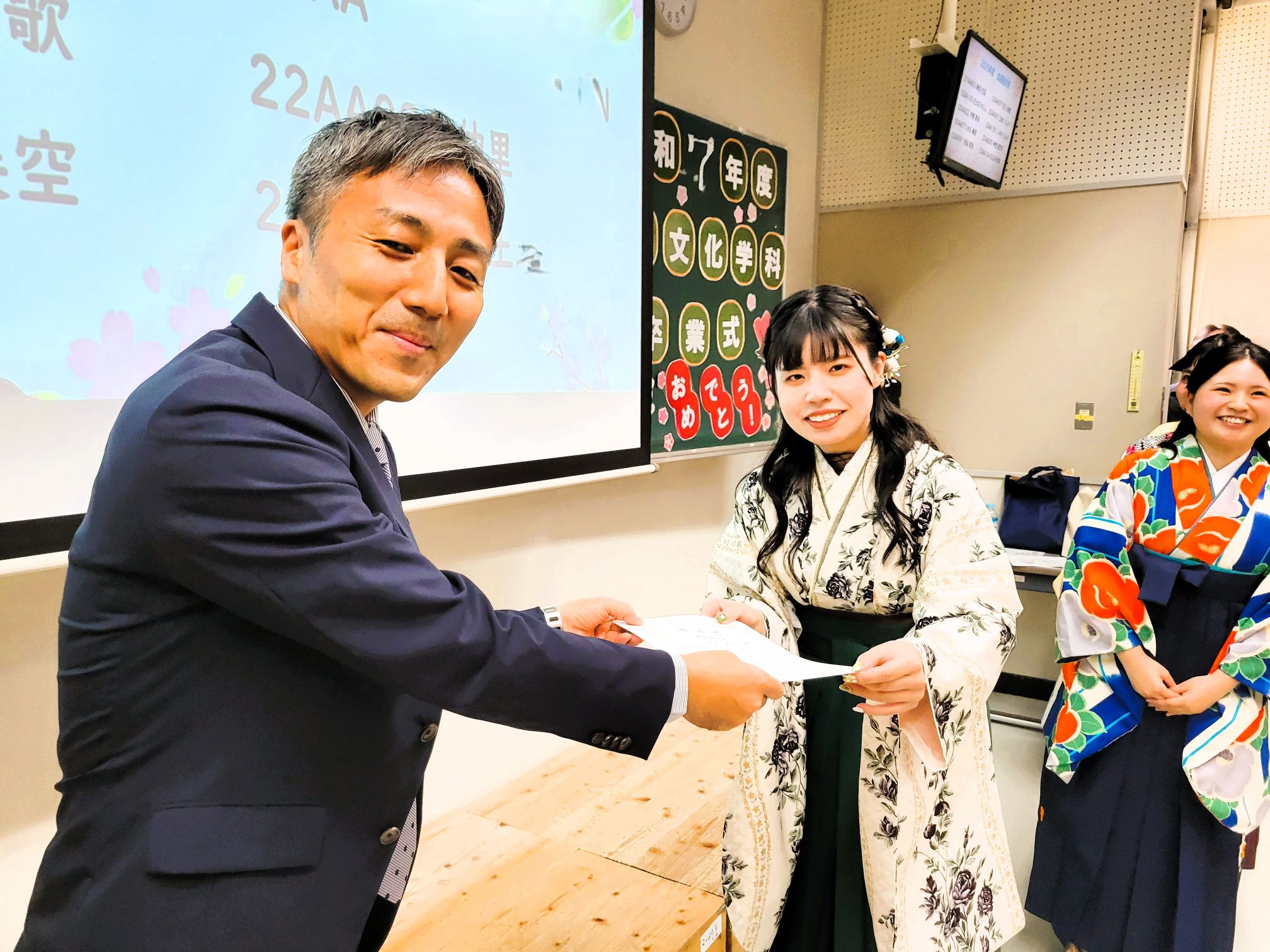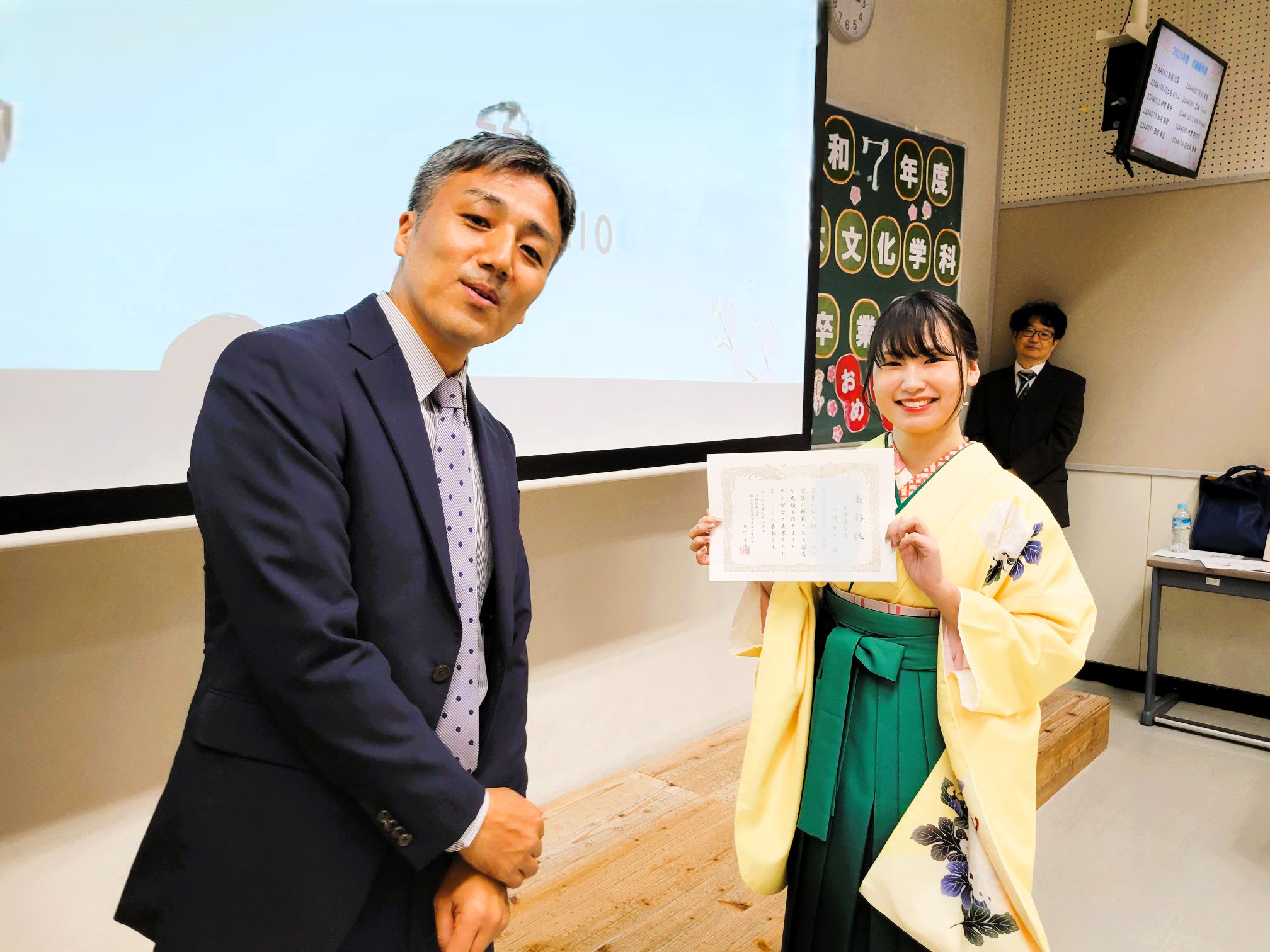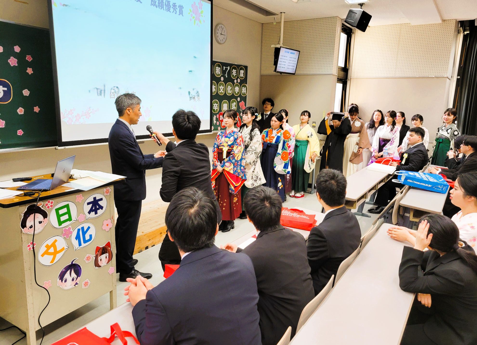 式典終了後、学科ごとに会場を分けて行われた卒業証書授与式では、日本文化学科4年生の成績優秀者10名の表彰も行われました。