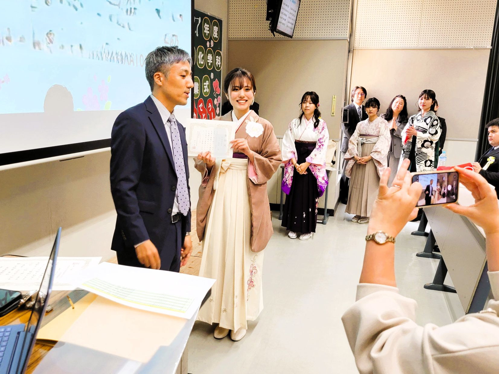 真面目な学生が多い特徴がある日本文化学科の学生さんたちですが、在学中は自分の成績順位を知る機会はないので、「え? なんで私が?」と戸惑いつつも、4年間の頑張りが評価されたことへの喜びをかみしめている様子でした。