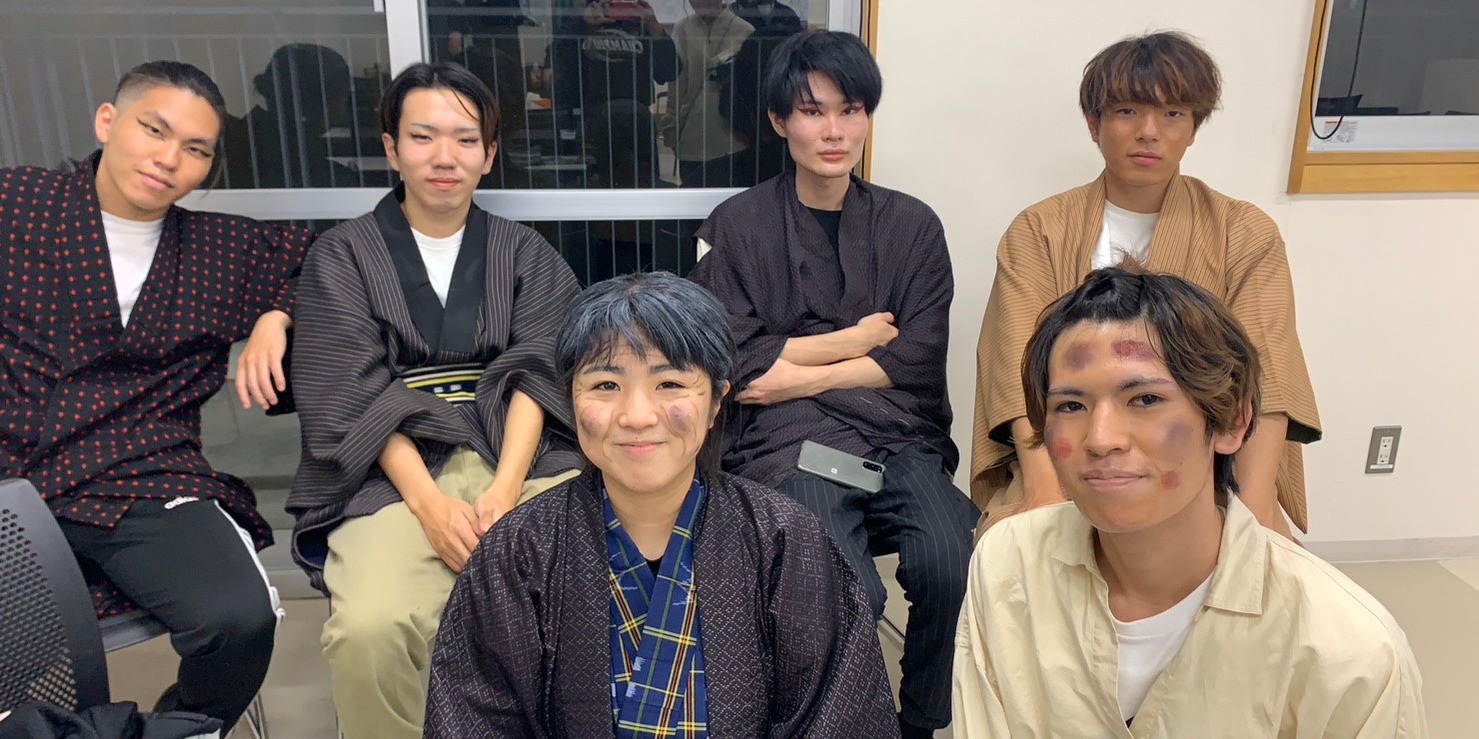一つ目は、一年生の時に受講した「日本語表現演習」と「プロジェクト演習」を通して行った舞台制作です。指導してくれた佐渡山先生は、アナウンサーやイベント制作など様々な形で情報発信に関わる仕事をしています。この授業のコンセプトは、学生が自分たち自身で監督、キャスト、衣装や大道具などすべて分担して舞台制作をすることです。私は演劇経験がなかったものの、貴重な経験になると思い主役に立候補し、めでたく主役に選ばれました。大学に入りたてで、高校までとは違いクラスのない大学では、学生同士のコミュニケーションが難しいのではないかと思っていました。実際にそういうことも多かったです。しかし、授業が進むにつれて、みんなでいいものを作るにはコミュニケーションは不可欠だと気付き、積極的にコミュニケーションをとれるようになりました。慣れないため大変なこともたくさんありましたが、みんなと仲が深まり最終的にみんなの納得のいく最高の演劇をつくることができたと思います。