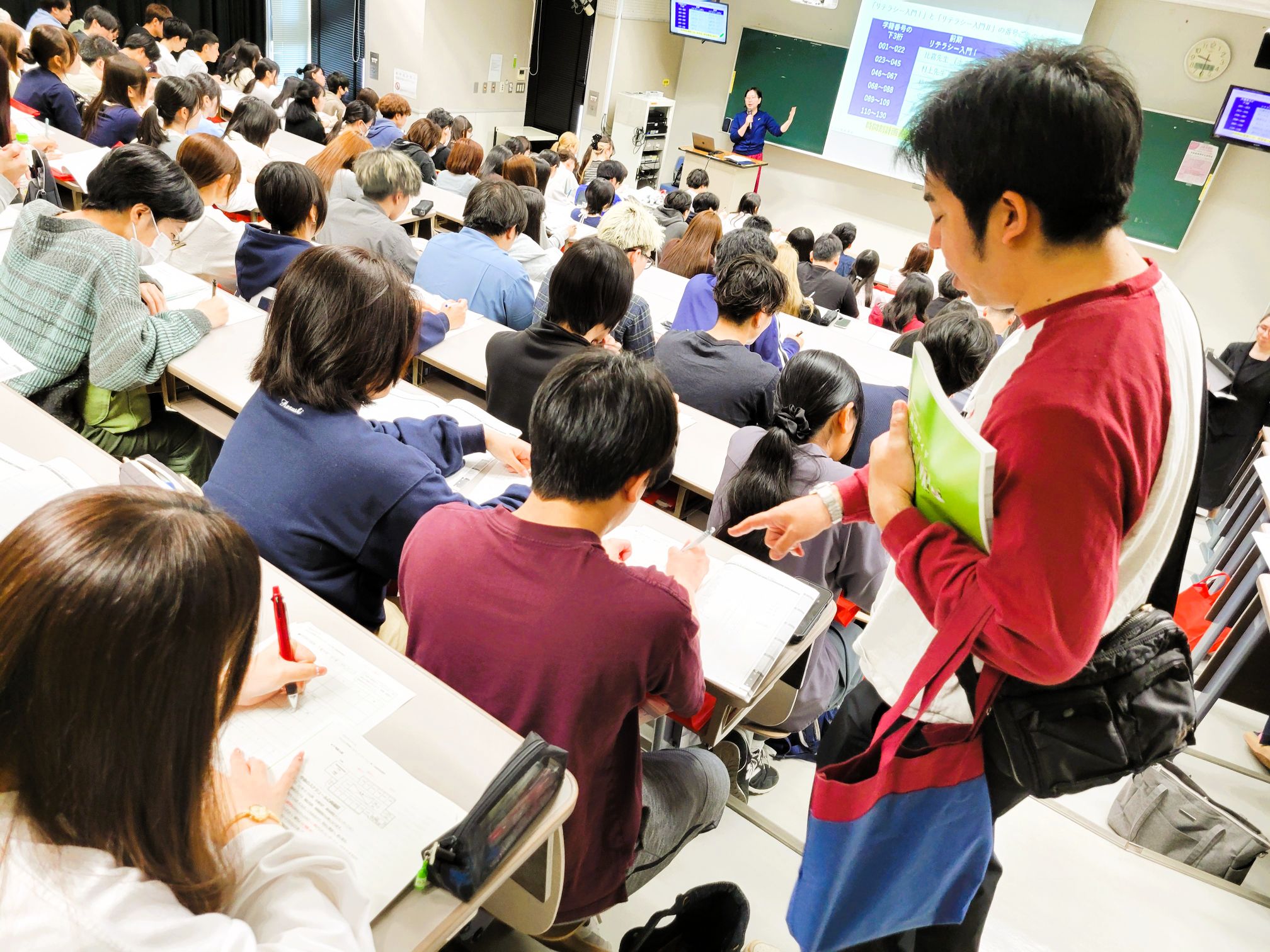 などなど、はじめて知る言葉ばかりで、戸惑った新入生も多かったようですが、各クラスの担任の先生たちや、国語科教職課程・司書課程・日本語教育副専攻課程担当の先生たちにも個別にサポートしてもらいながら、少しずつですが、1人1人が自分のペースで大学の授業登録のシステムをマスターしていっている様子が印象的でした。