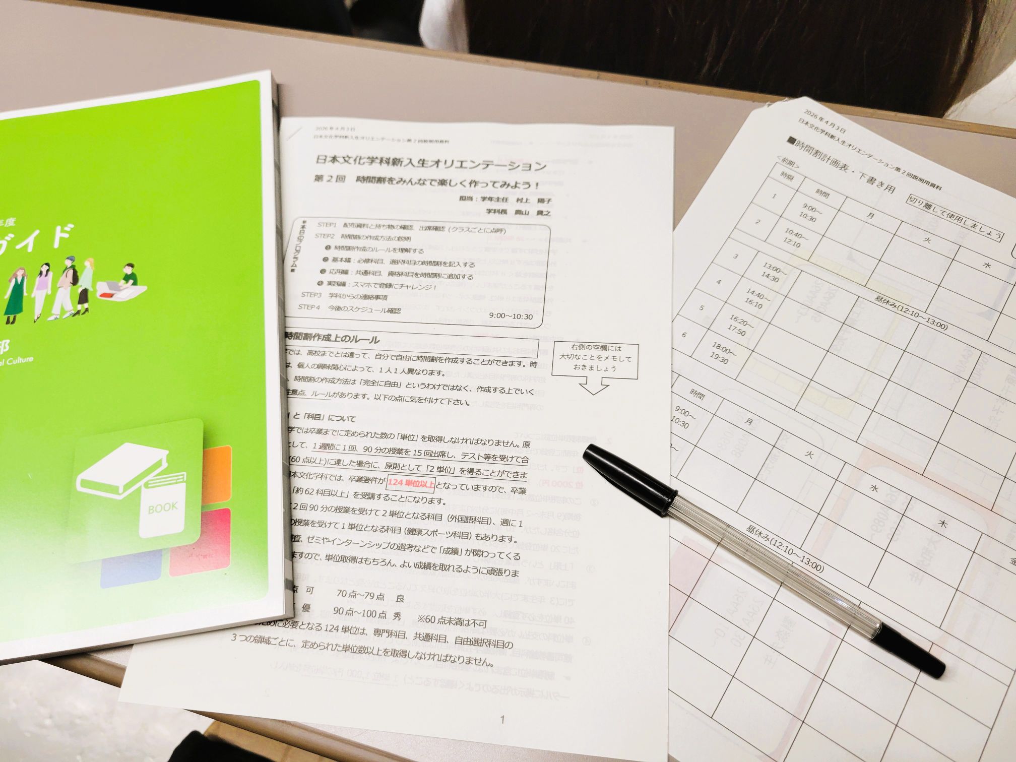 2026年4月3日は、新入生のための第二回オリエンテーションが開催され、朝9時から、学年主任の村上先生の説明の下で、クラス担任の先生も集まって、1年生全員で前期の時間割作成方法を学び合いました。