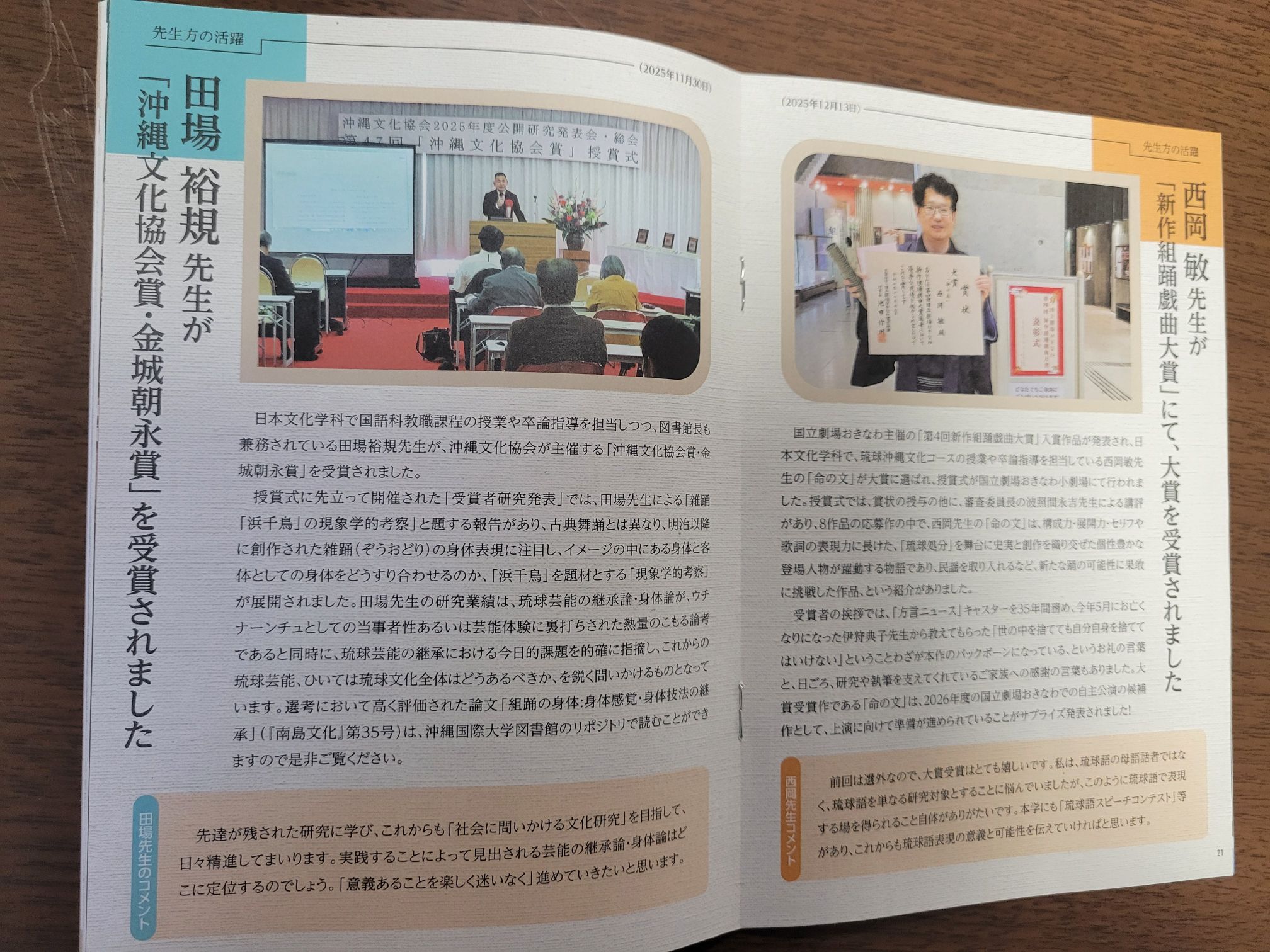 田場先生は沖縄文化協会が主催する「沖縄文化賞・金城朝永賞」を、西岡先生は国立劇場おきなわが主催する「新作組踊戯曲大賞」をそれぞれ受賞され、取材に対して以下のようなコメントを寄せておられます。