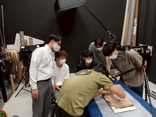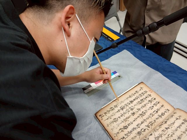 学科の卒業生でもある大城直也学芸員に教わりながら、学生たちは約200年前の貴重な古文書を1枚ずつ丁寧にめくり、撮影していきました。