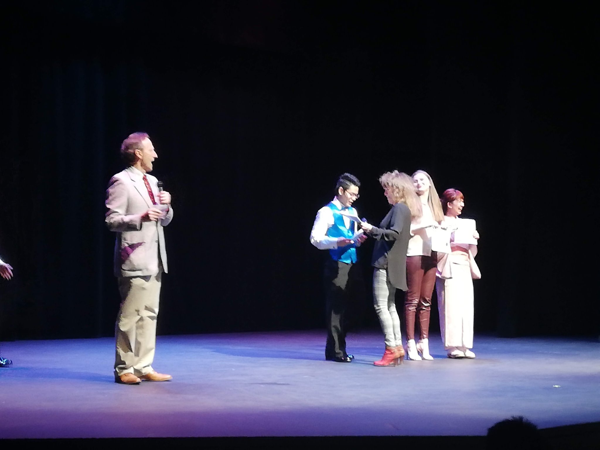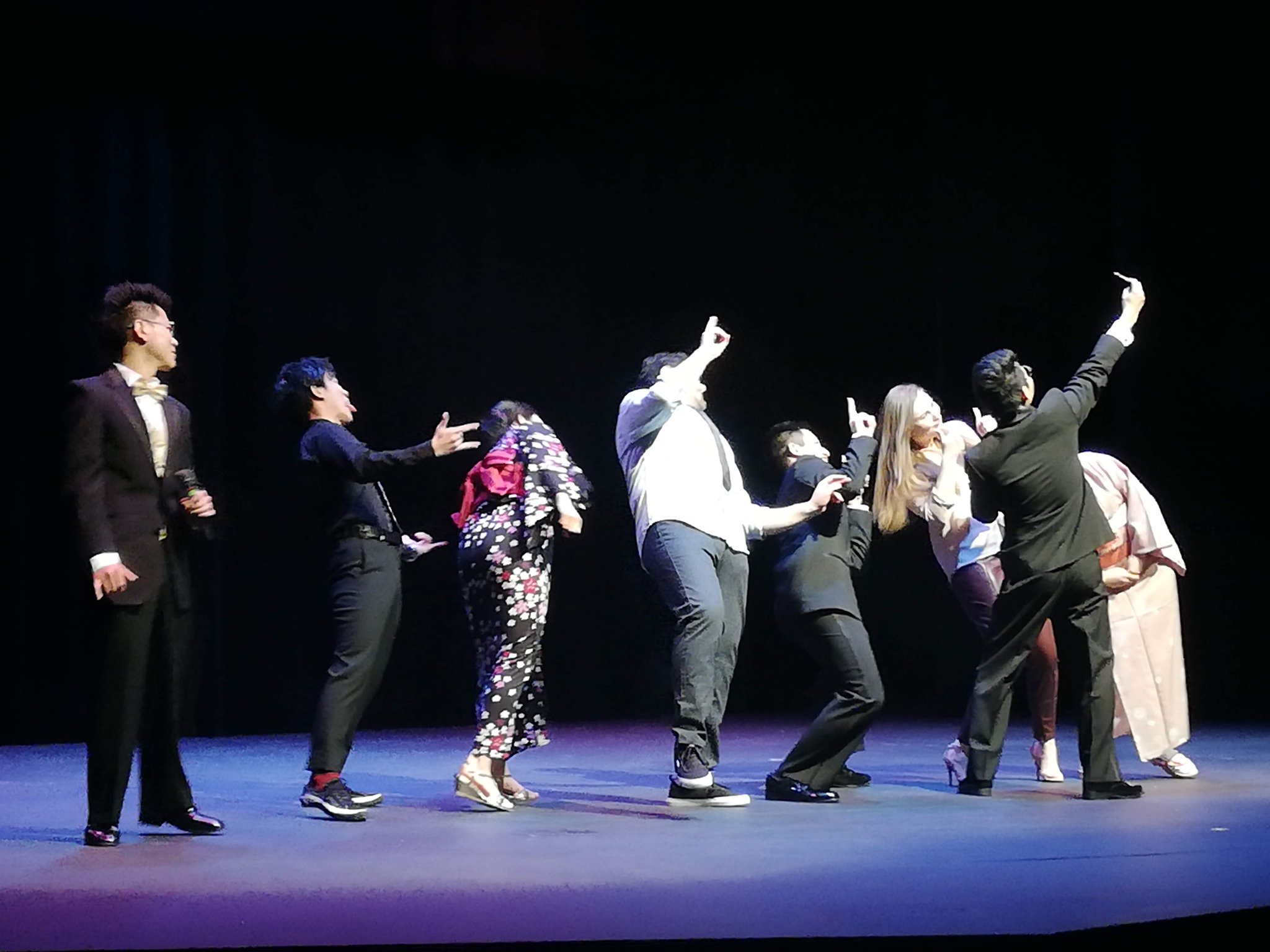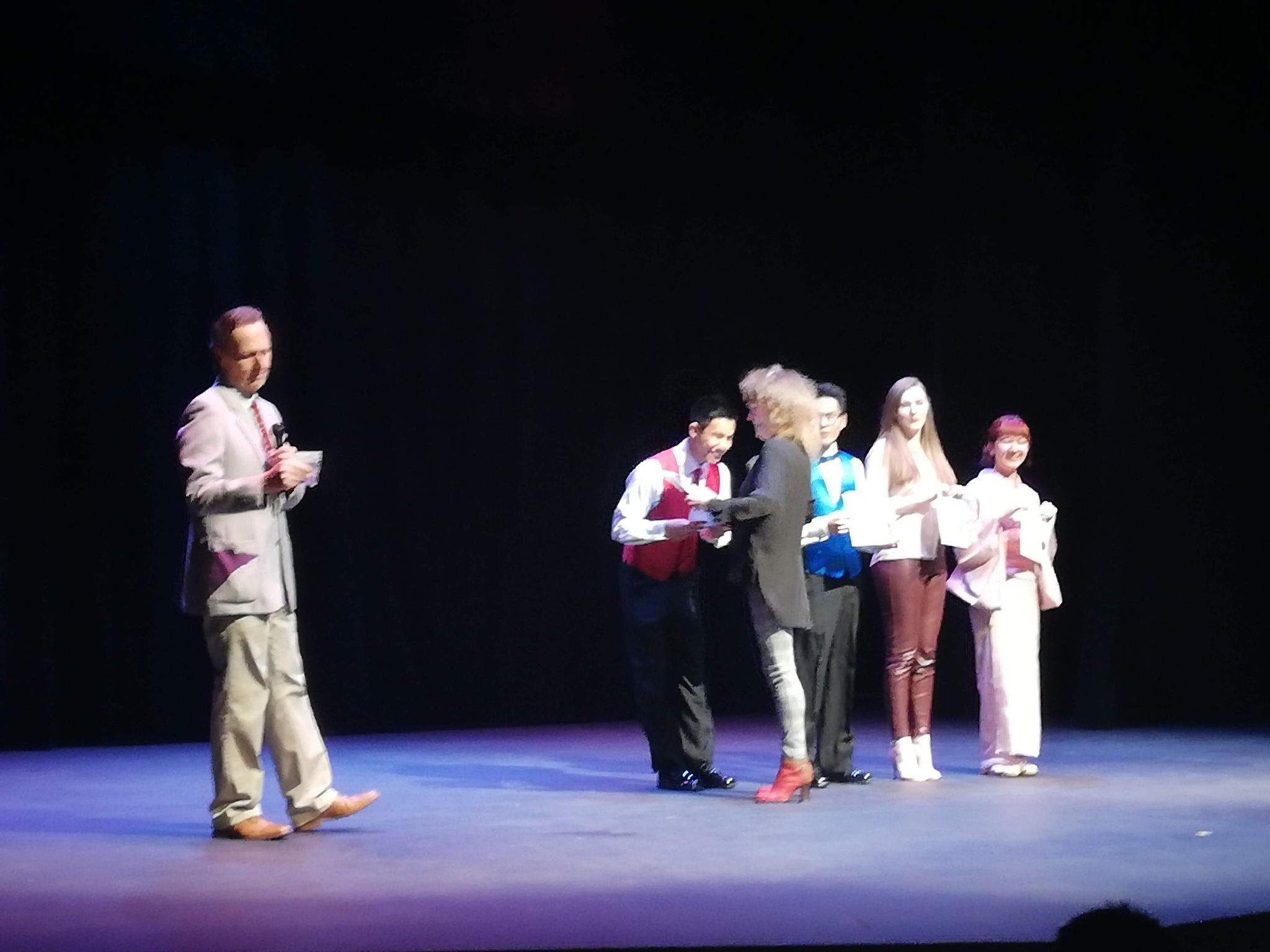 添付した写真は今学期のsemester celebrationでのひと場面です。前学期の宮里さんのピアノに続いて、大城さんと宇根さんが司会をしました!1枚目は舞台上で自撮りをする宇根さんと進行をしている二人の写真です。個人的にチッ◯とデー◯感があって、とても好きな写真です。2人とも司会進行お疲れ様でした!