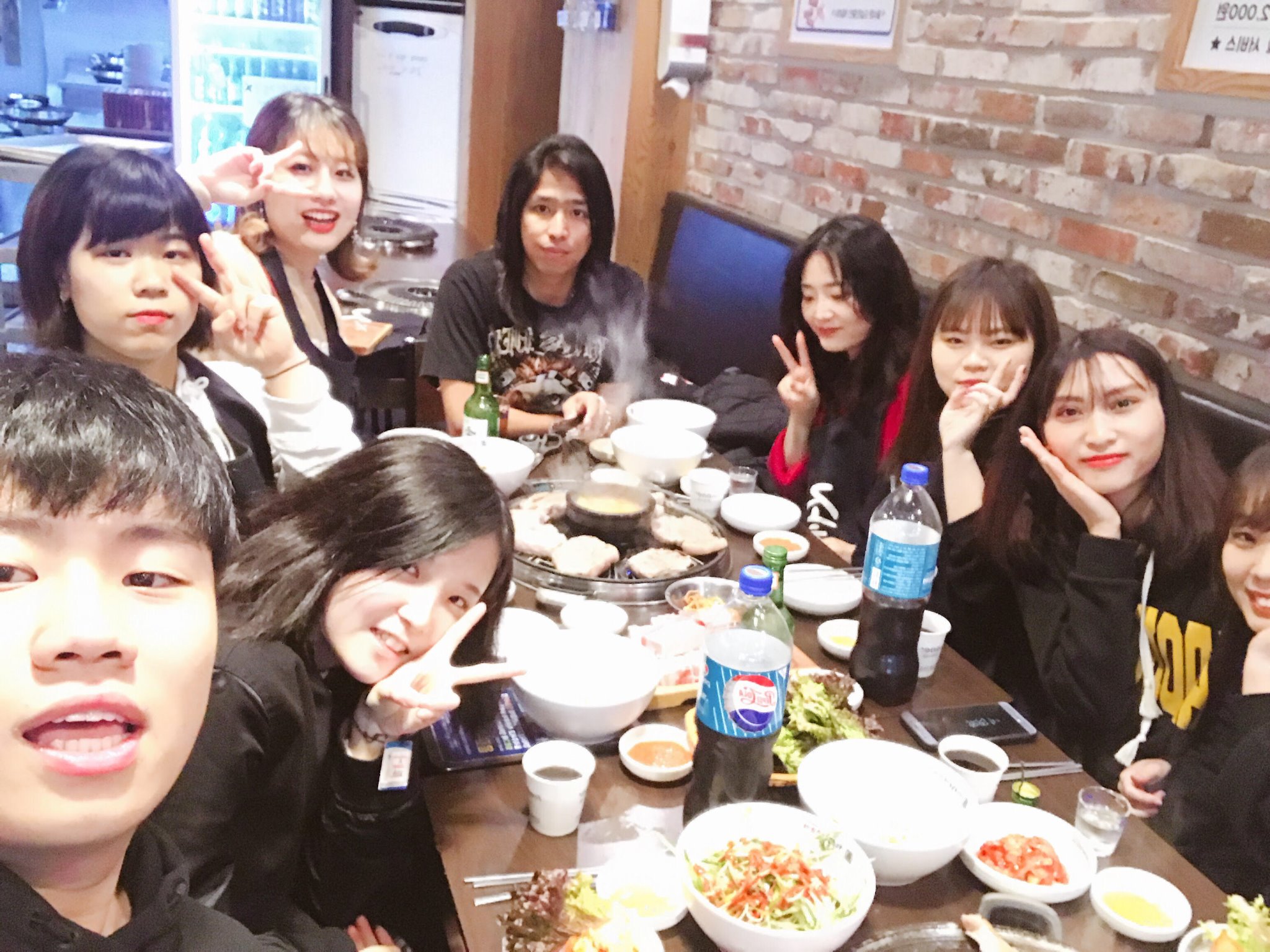 また、アイフレンドとは別に、日本語サークルが行なっている言語交換の場が週に一度あるので、友達と一緒に3月27日に初めて参加してみました。この場では、1つの教室の中に大勢の人が集まっていて、1つのテーブルに日本人4人韓国人5人程度で韓国語、日本語を交えて沢山お話をしました。参加しているみんなが日本に興味を持ってくれて、日本へ旅行に行きたいなどと言ってくれました。この交流会が終わった後には、大学近くのお店にメンバー全員でお酒を飲みに行って、歌ったり踊ったり、日本ではないような、とても楽しいお酒の場を体験することができました。