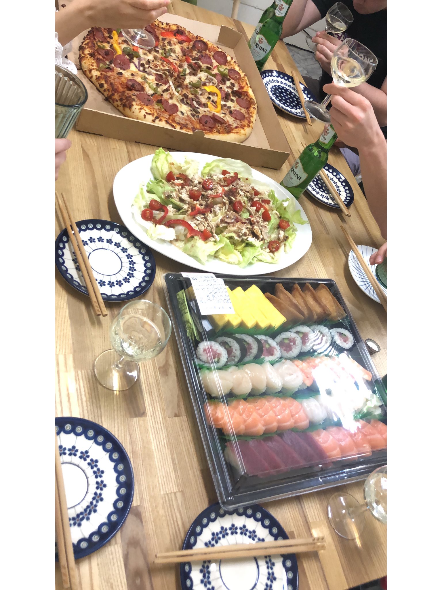 3月後半には、華語中心のクラスメイトの家で台湾に来て1ヶ月のパーティーをしました。クラスメイトの同居人が車を出してくれて、コストコで生活用品や夕飯の買い物をして、家で食事しました。久しぶりに寿司やピザ、更に台湾では滅多に食べられないサラダを用意してくれて、とても幸せな気分になりました。