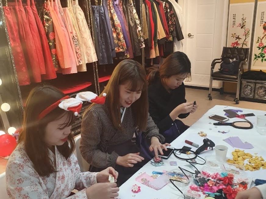 そして、12月にはアイフレンドの行事であるアイホビーに参加しました。アイフレンドは以前紹介したと思いますが、アイホビーは、アイフレンドに入っている外国人と韓国人が毎月のイベントに参加して交流を深めるというものです。毎回、いろんなテーマに基づいて様々な体験ができるのですが、今回のテーマは「髪飾り作りと韓服体験」でした。自分の好みに合わせて髪飾りを作ることが初めてだったので、新鮮でとても楽しかったです。また、韓服は昔のスタイルではなく、現代風の"生活韓服"というものを着てみました。現代風の韓服は、昔の韓服に比べてシンプルな構造になっており、スカートの丈が少し短くなっているので動きやすかったです。アイフレンドのサポーター達も親身になって教えてくれたり、その後、みんなでご飯も食べに行って仲良くなれたので、この毎月開催されるアイホビーにぜひ参加してほしいなと思います!!
