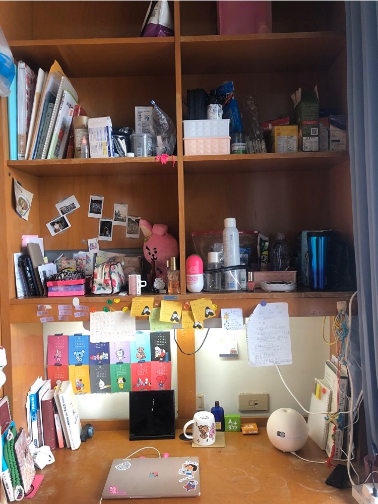 次に寮について紹介します。みなさんは寮に対してどのようなイメージがありますか?私は留学前に先輩から「汚い」と聞いていました。確かに、日本から来たばかりの時は部屋の棚はホコリがかぶっていました。ですが掃除をして、自分の持ってきたものを置いたりすると、あっという間に自分の空間になります。範囲は狭いですが今ではとても落ち着く場所です。夏は暑いのでクーラーと扇風機を付けています。クーラーはカードにお金(100元~)をチャージしないと使えません。扇風機は無料なのでいつでも付けることが出来ます。外国=トイレが汚いというイメージがあると思います。私も日本に敵うトイレはないとおもいます。(もちろん台湾でもデパートなどはとても綺麗です)寮や学校内はトイレットペーパーが流せないので、掃除当番が回ってくるまではゴミ箱がたくさんだったりもします。お風呂は、各個室にシャワーがあるだけです。洗濯機は各階に一つずつあります。30分20元(70円)で回すことが出来ます。洗濯が多すぎないときは、友達などと回す方が洗剤やお金の節約になります!私は、日本から持ってきた洗剤、柔軟剤を使っています。台湾で気軽に買えますが、もし匂いなどこだわりがあるなら持ってきた方がいいと思います。(台湾で売っている日本製品は高いです)また、寮の各階、華語中心、学校内どこにでもお水を入れるサーバーがあります。寮にあるものは、熱湯か常温のお水ですが、買わなくてもお水が飲めるのはとても便利です!!