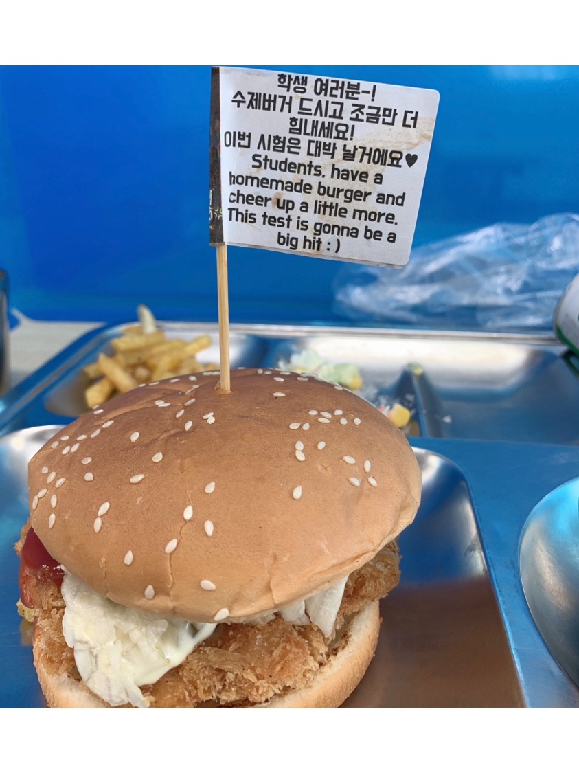 続いては「期末テスト」です。私は今、学部に通いながら語学堂に通っています。私の留学は語学堂がメインで、学部は+αで学ぶ、そんなバランスにしています。日本の大学と同じように、中間期末テストがあり、それに向けて学生は必死で勉強します。ここで感じたのは、韓国の大学生は常日頃からの勉強量が日本の大学生より多いことです。また、第二言語として学んでいる外国語のレベルが高く感じます。私も負けないように頑張りたいです。さて、期末テストですが、中間テストと同じようにオンラインで行われました。私がとっている授業内容が韓国の文化についてなので、勉強をしながら文化を身に着けている気がしてとってよかったなと感じました。また期末テスト応援ということで、寮の食事でメッセージ付きのハンバーガーや、国際交流部の方々からフルーツなどをいただきました。とてもうれしかったです。期末テストも無事に終わり、ついに学部は夏休みに入ります。韓国での夏は初めてなので楽しく過ごしたいと思います。