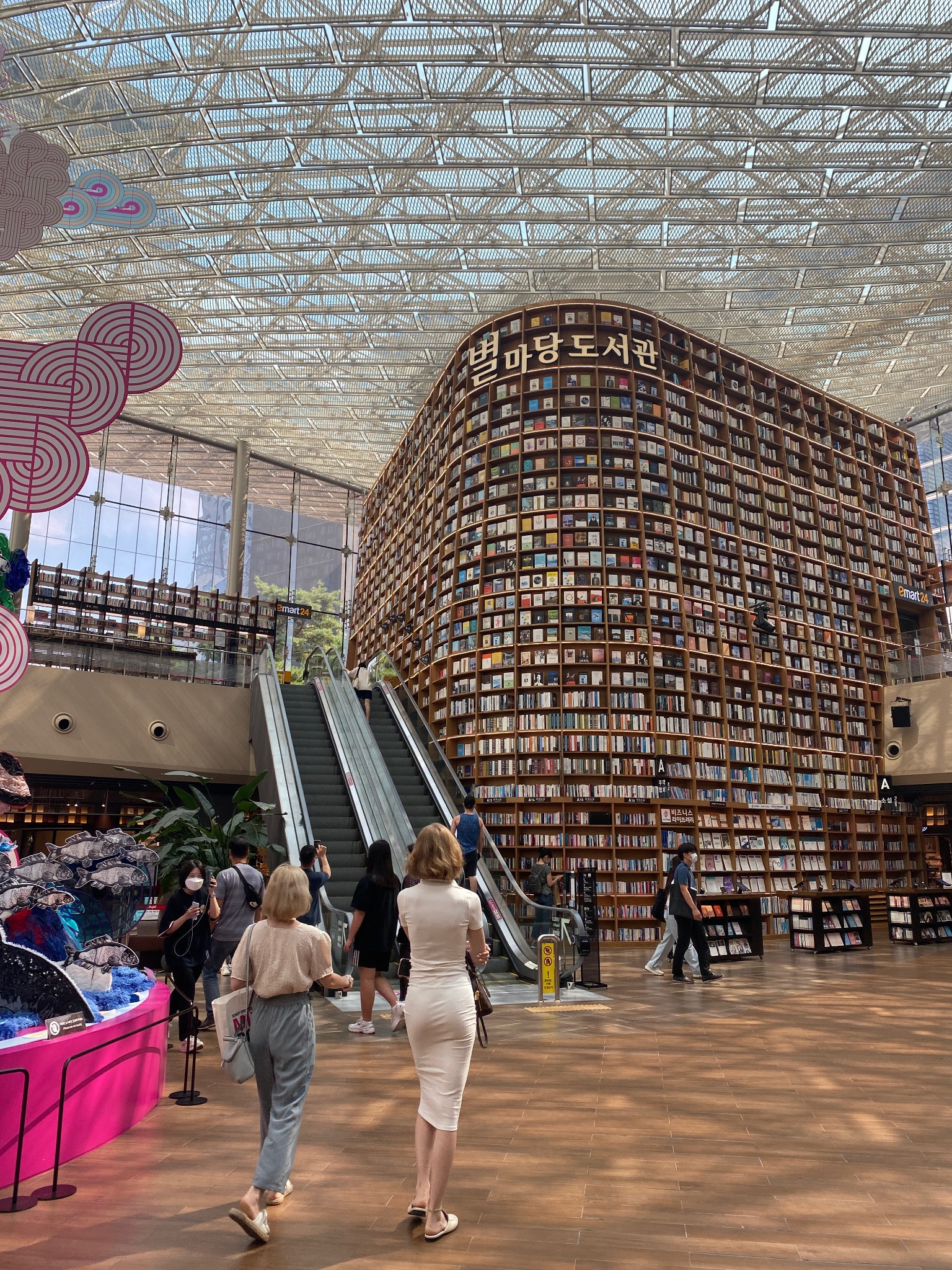 また、7月末にはソウルにも行ってきました。COEX MALLという大きなショッピングモールに行って、별마당도서관という大きな図書館やモールの中にある水族館に行きました。図書館には巨大な本棚があり、館内ならどこでも自由に本が読めるらしく、床に座って本を読む人が沢山いました。水族館もショッピングモールの中にあって、ショッピングモールの中だとは思えないくらい広くて、魚だけでなくウミガメやペンギン、プレーリードッグもいました!