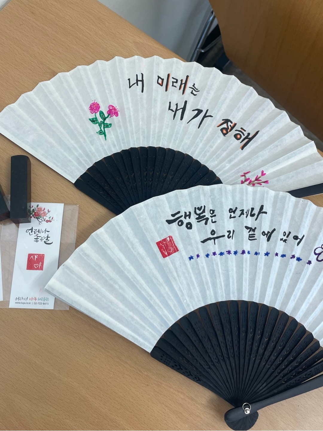 語学堂での文化体験では、まだコロナの影響でクラス単位の外出はできないということで、教室でカリグラフィーの先生を招いて、扇子のデザインとハンコの作成をしました。カリグラフィーはハングルを美しく見せるための書法で、ハングルを手紙やデザインで良く使われています。色々なフォントの練習をしてみて、自分の好きな言葉を扇子にデザインしてみました。ハンコは中学校の美術でも作成したことがありましたが、ハングルで自分の名前をデザインをするのがすごく新鮮でした。扇子に好きな絵を描いてみたりハンコを押してみたり自分だけのセンスが完成しました!1人でできるような体験ではないので、教室内でも文化体験を充実してできたなと思います。
