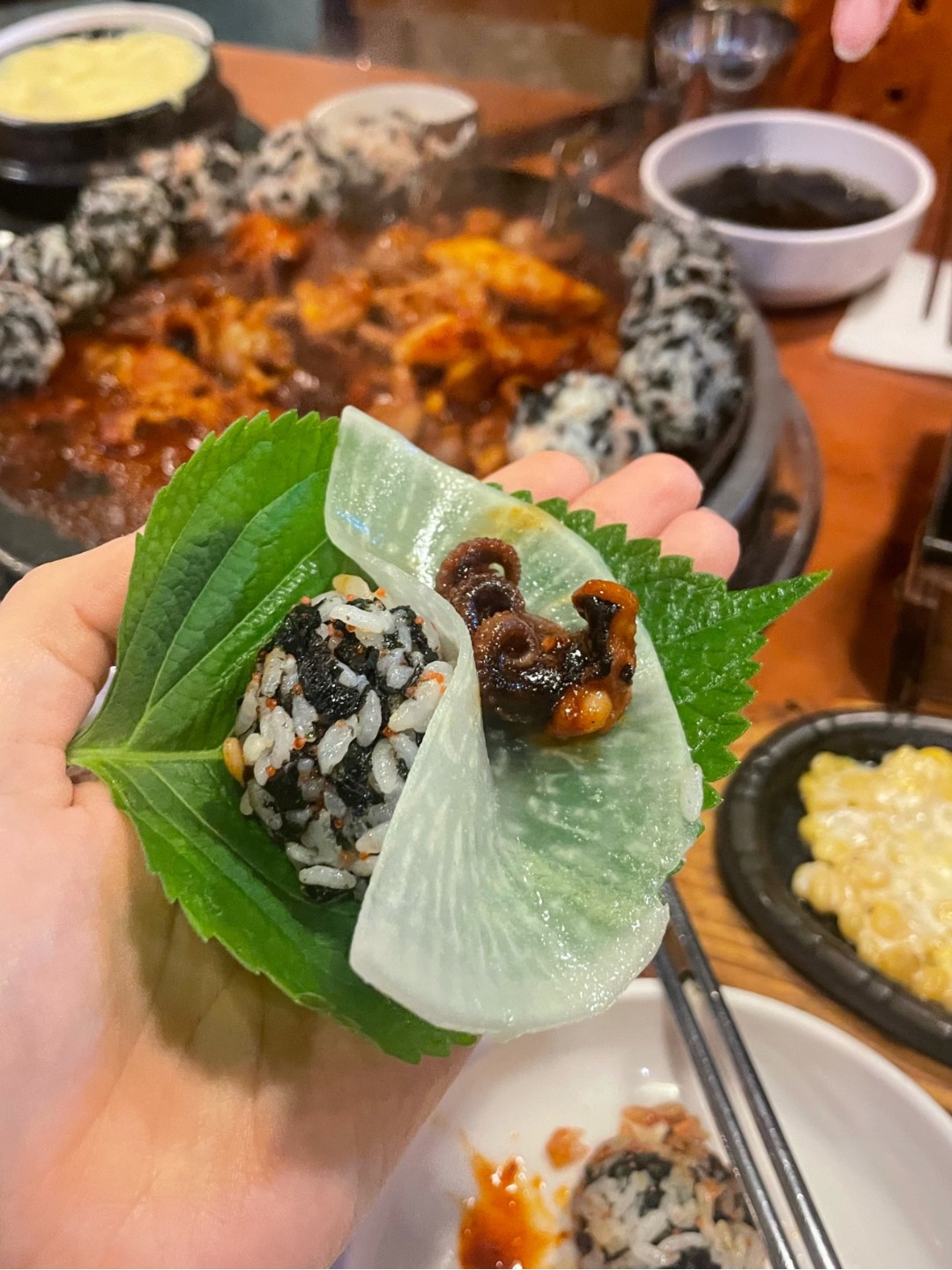 仲のいい韓国人のオンニと毎週会ってご飯を食べながら、少し日本語を教えたりしているのですが、これまで韓国料理を一緒に食べてきて、よく感じることは包んで食べる料理がとても多いと言うことです!エゴマの葉やサンチュ、大根を薄くスライスしたムッサムなどと、好きなヤンニョムやおかずを包んで食べる文化があって、サムギョプサルなどは知っていましたが最近食べたチュクミ(イイダコ)は包んで食べるのは初めてで、やはり韓国料理は韓国人と食べると美味しい食べ方を教えてくれるなと感じました!人それぞれ好みの食べ方もありますが、日本では完成した料理が出てきて、おかずがたくさん出てアレンジして食べるというより、そのまま食べる料理が多いので食文化の違いを感じることができました。食堂によっては、親切な店員のおばちゃんが美味しい食べ方や火加減などを教えてくれることもあるので、韓国で韓国料理を食べる時は是非地元の人のように食べることをおすすめします!