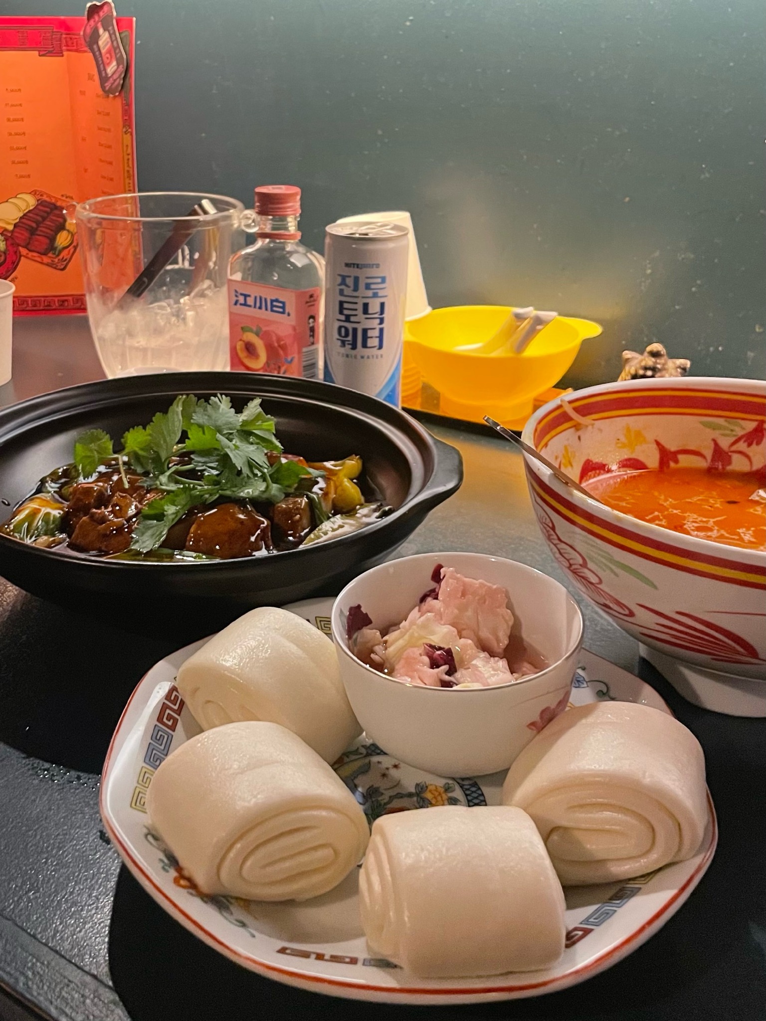 ベトナム料理の次は中国料理も食べました。日本で食べる中華料理とは違っていて、本格的な中国の料理と고량주(コリャンジュ)という中国のお酒も飲んでみました。麻辣湯((マーラータン)は韓国の唐辛子の辛さとはまた違う中国の麻辣(マーラー)という香辛料の辛さで、お酒は韓国の소주(ソジュ)よりも度数が高く、独特な香りがしました。韓国人のお友達と食べに行ったので、韓国料理と比較するのも楽しく、食文化の話もすることがきて新鮮でした!
