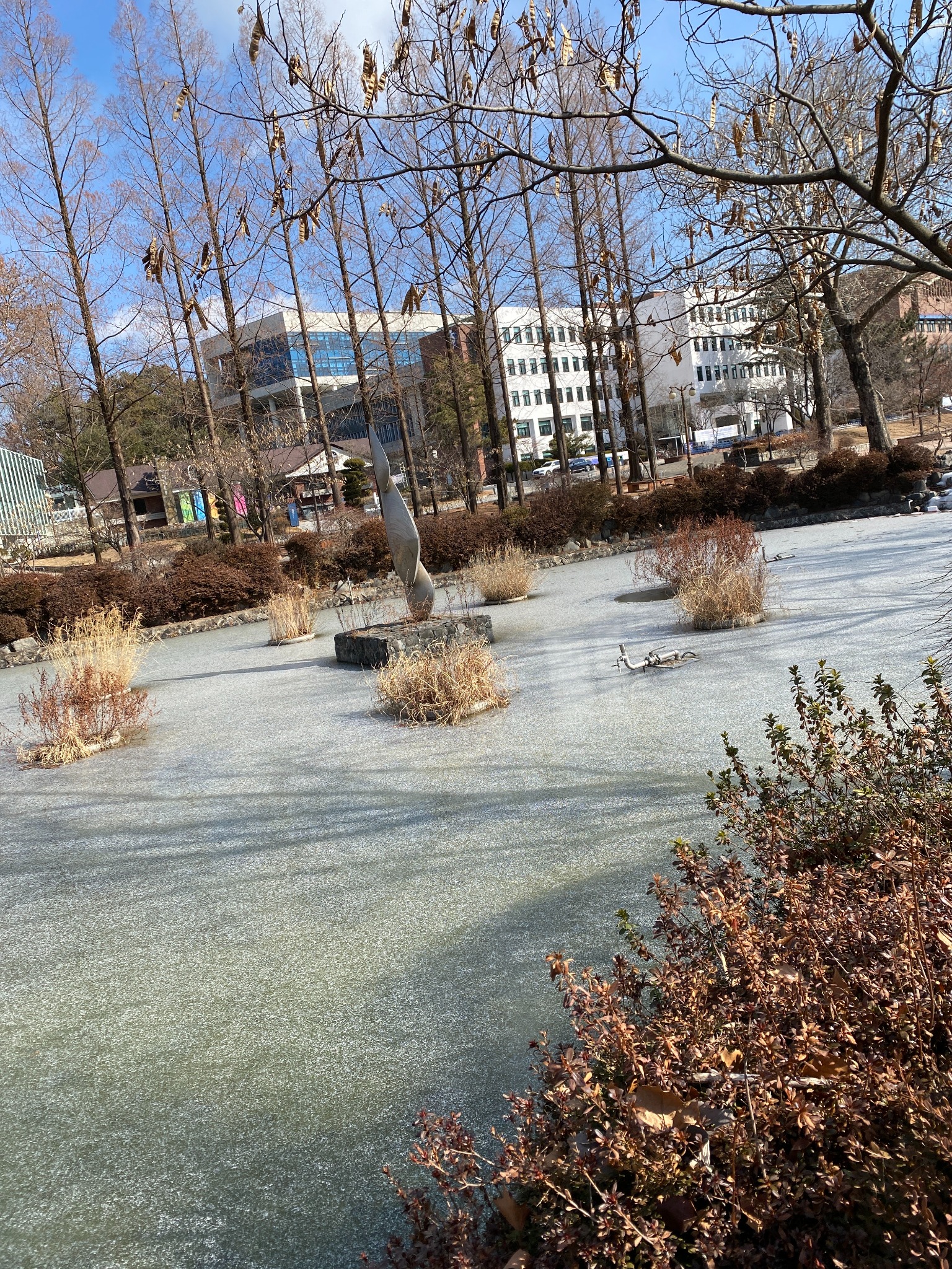 アンニョンハセヨ〜!! 韓南大学に派遣中の當銘です。年が明けて2022年となり韓国での留学生活も残り1ヶ月を切りました。1月の韓国も相変わらず厳しい寒さが続いていて、氷点下の気温はもう当たり前のようになっています。氷点下の気温が続いているため、韓南大学の敷地内にある池も凍ってしまうくらいです。 韓国の冬は想像以上に寒いので、冬に韓国を訪れる人は防寒対策必須です!!!