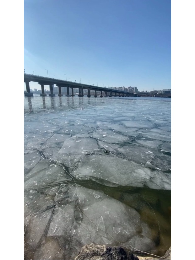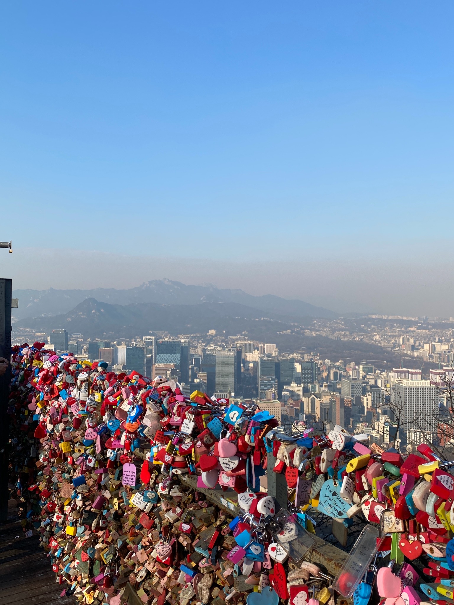 また、1月の中旬には語学堂の中間試験もありました。普段の授業は現在、非対面で行っている状態ですが、試験の日だけ対面で行うことになりました。その時に初めて冬学期の先生とクラスメイト達に会うことが出来ました。中間テストが終わると、ソウルにいるお友達の家に遊びに行ったのですが、お友達の家が漢江から近くて漢江まで散歩していたら、あの大きな漢江の水まで凍っていて衝撃でした、!!沖縄では絶対に見れない風景なのですごく新鮮で見てるだけでも楽しかったです! そして、お友達が私が1度行ってみたかったNソウルタワー(南山タワー)にも連れて行ってくれて、あの有名なカップルの南京錠だらけの場所も見てきました!