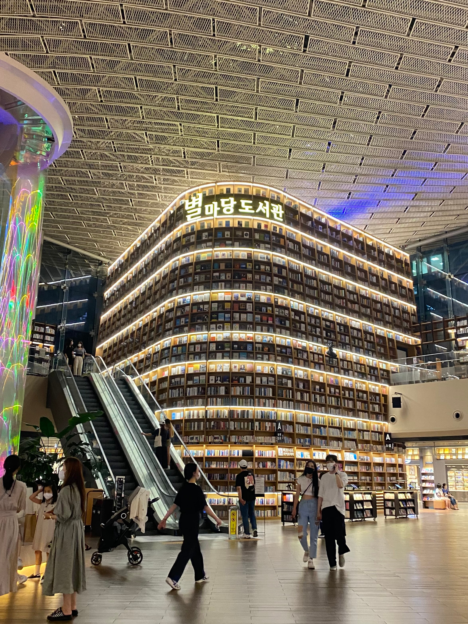 COEXモールにあるピョルマダン図書館(별마당 도서관)に行きました。テーブルやソファも完備されており、蔵書は約5万冊とされています。本は施設内での閲覧のみ無料で行われています。コンセント付きの座席や、目の前にはスターバックスもあるため、作業をする人も多くみられました。별마당とは“星の庭”という意味で、夜は照明が図書館を照らし、昼とは雰囲気が違いました。ピョルマダン図書館も、日本にいたときから訪れたかった場所だったため、行くことができてとても嬉しかったです。