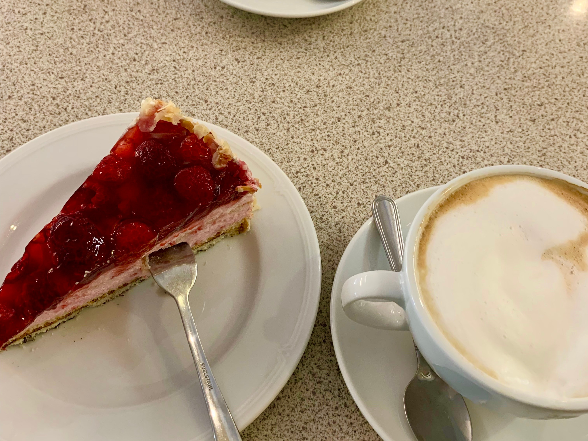 まずは、フォークを横刺しすることです。カフェでケーキを注文すると、高確率で、フォークが横刺しされて出てきます。綺麗な状態で写真を撮りたかったのに...と思いながらも、なぜドイツではわざわざケーキにフォークを刺して持ってくるのだろうと不思議に思っていました。他にも、屋台で定番のカリーヴルストやアイスクリームを買ったときもグサッとスプーンが刺さって出てきます。調べてみたところ、「フォークやスプーンを皿から落とさないように刺している」というドイツ人の合理的な考えに納得させられました。時にはフォークが垂直に刺さっていることもあり、日本人の私は驚くことがあります。日本ではタブーとされることがドイツでは当たり前に行われていることがあり、異文化を感じています。