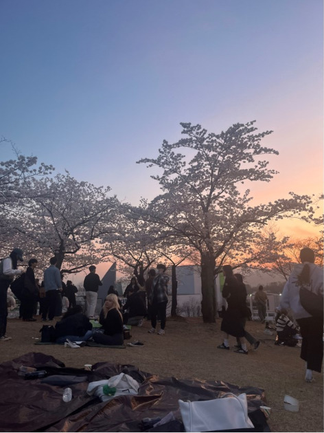 次に、学校で行われていた行事について紹介したいと思います。韓国では3月後半から学校内でも桜がきれいに咲き始め、봄 축제(桜祭り)が開催されました。屋台も沢山あり、満開の桜の木に囲まれた広場ではテントも設置され多くの人が敷物をしき友達と集まっていました。歌を披露する人がいたり、屋外で「君の名は」も上映され、みんな屋台で買ったものを食べながら楽しく鑑賞していました。私も韓国人の友達と一緒に鑑賞しましたが、映画は日本語に韓国語の字幕付きで上映されていました。韓国人の方が日本の映画を楽しんでいる姿を見て、少し不思議な感覚でした。映画は夜の7時から上映されため寒かったですが、屋外で映画を見るのは初めての経験であり、私が海外の大学に抱いていたイメージだった為、とても楽しかったです。