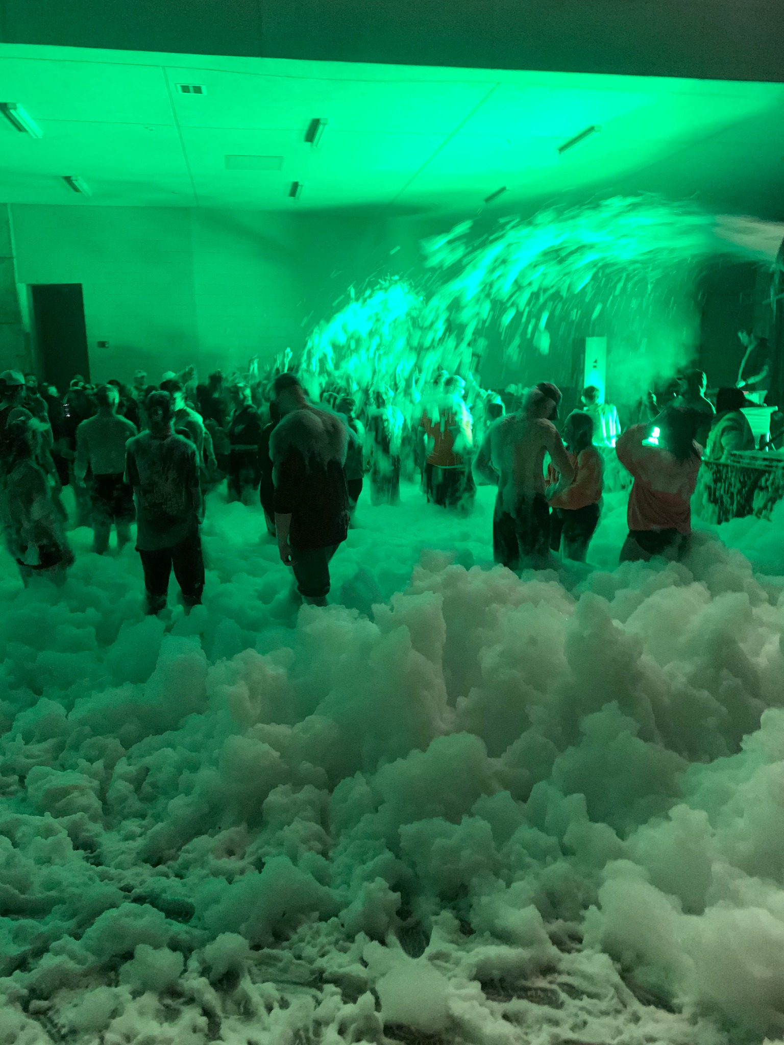 次は学内でのイベントについて話したいと思います。3月はカジノナイトとFoam Danceがありました。カジノナイトは学内で行わるイベントの中でも大きく学生に人気のイベントで、私もアメリカに来る前からこのイベントを知っていたのでとても楽しみでした。本物のお金を賭けるのではなく、入場する時にもらえるチップを使ってカジノのゲームをします。ゲームに勝って稼いだ分のチップは、番号と色のついた紙に変えられ、それはイベントの最後にランダムで抽選のようなことが行われ当たったら、商品と交換できました。私の友達は掃除機が当たっていました。カジノを体験することはなかなかないのでとても楽しかったです。