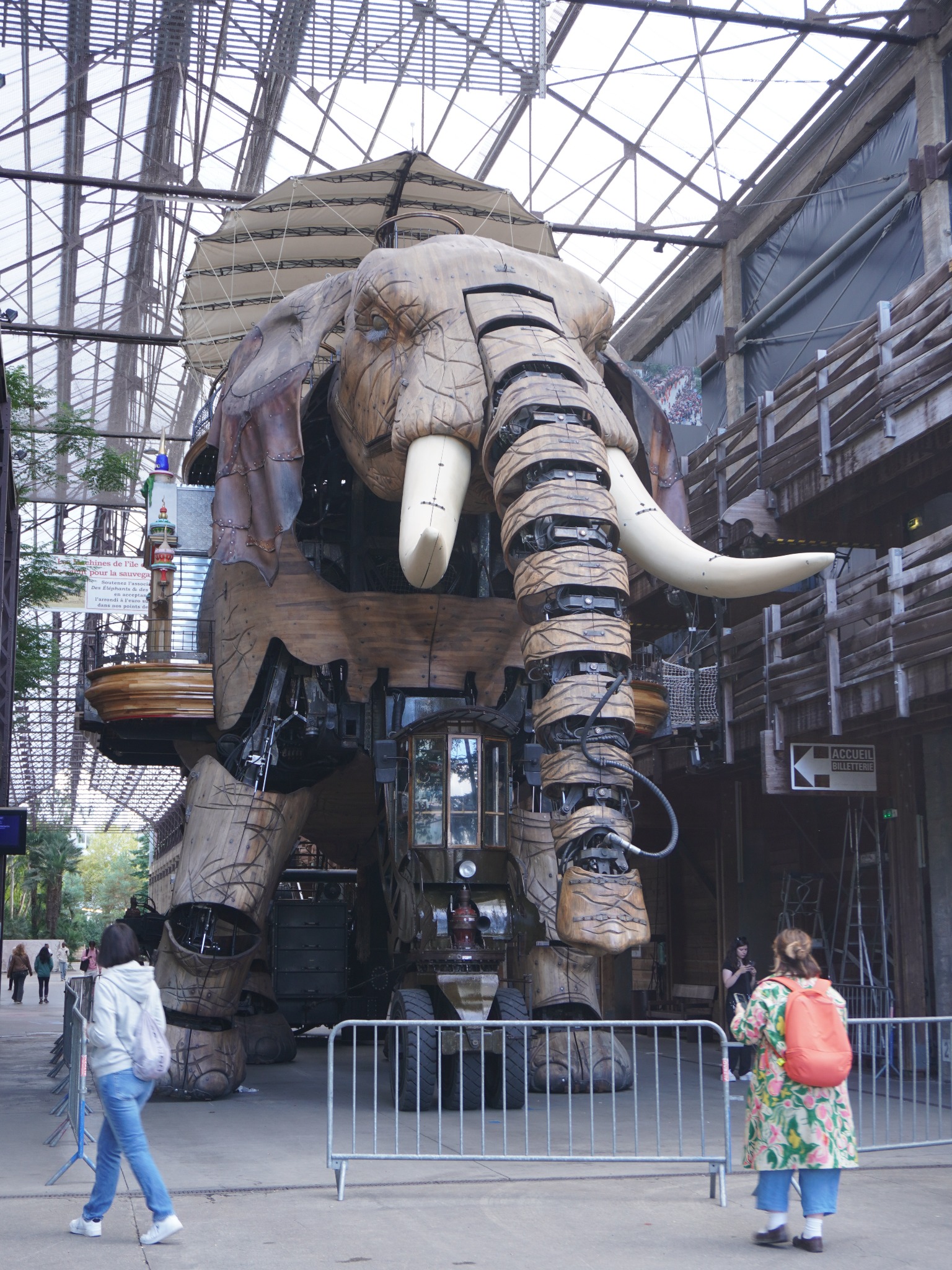 次に、高さ12mで重さ48tある機械仕掛けの巨大な象の見学。クリエイター集団「ラ・マシン」が作った象は、本物と見間違えるくらい迫力があります。土日には、有料でその象に乗ることができるので、ナントに訪れた際にはぜひ機械仕掛けの巨大象を見学してください。