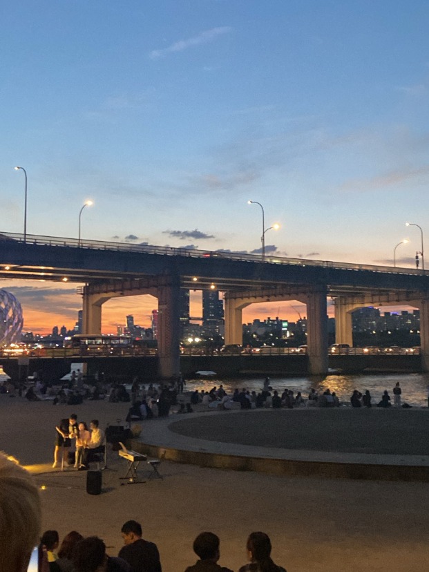 少し寒くなった23日には、上原さんとバンポ漢江公園で噴水を見ながらゆっくり時間を過ごしました。この日は、厚めのカーディガンを着ても少し肌寒い程度で暑かった夏休みを送った私達にはすごく過ごしやすい気候でした。一緒に夜景を見ながらピザなどを食べ、話を交わして、忙しく過ごす生活を少しの間だけでも忘れることができ、ヒーリングできました。