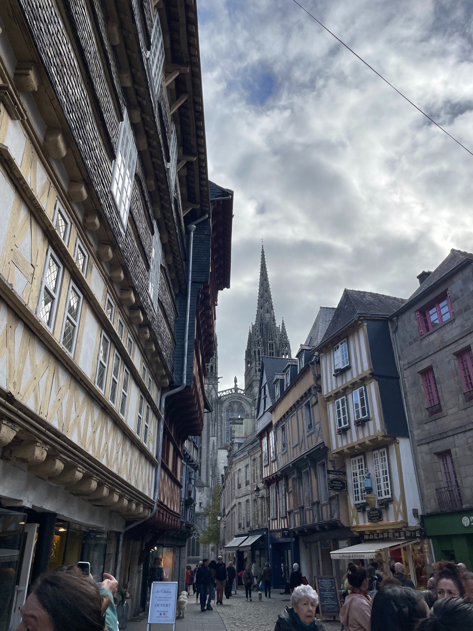 まずCIREFEのイベントでプチ旅行に行きました。プチ旅行はフランスのブリュターニュ地域圏のフィニステール県にある「ポン=タヴァン」「カンペール」「コンカルノー」の3つの地域に行きました。ガイドの方から街の説明を受け、学びも深められました。今回行った3つの地域はとても自然があふれていて素敵な場所でした。特にコンカルノーは海がある地域で沖縄と似ている雰囲気があり、行った地域の中では一番コンカルノーが好きでした。漁業が盛んなコンカルノーの街を散策し、なかでも最も素晴らしかったのがVille Closeと呼ばれている小島です。見た目は要塞のようで石壁で囲われていますが、小さな石橋を渡りVill Closeの中に入ると外観ではわからなかった街の賑やかさ、発展している部分が見られました。中にはカフェ・レストラン・漁業博物館・ブティックなど様々な店舗や施設がありました。次にポン=タヴェンは多くの画家が滞在した街であり、ゴーギャンも活動を行っていた街です。街並みは緑と川が多く自然があふれ、とても綺麗でした。多くの画家が滞在していたためか、街のあちらこちらで個展が開かれていたり美術館があったりと本当にアートがあふれた街でした。最後にカンペールでは、ブリュターニュ地方に多い建築について教えていただきました。「ヴァンヌの木骨づくり」と呼ばれる建築方法で建築されており、上の階になるほど広くなっていました。歩いていると道に覆いかぶさるような形に見え、真下から見ると階段状に上の階になるにつれて飛び出しています。下の階が小さい理由として、建築当時の家の税金は一階の敷地面積で金額が決っていたからだと教えていただきました。地震が多い日本では考えられない形の作りだったため、無意識に耐久性が気になりましたが、地震がないフランスとの地域の違いを感じることができた機会でした。どの地域も興味深く、素敵だったので留学期間中のバカンスの際にでも再度訪れたいと思いました。