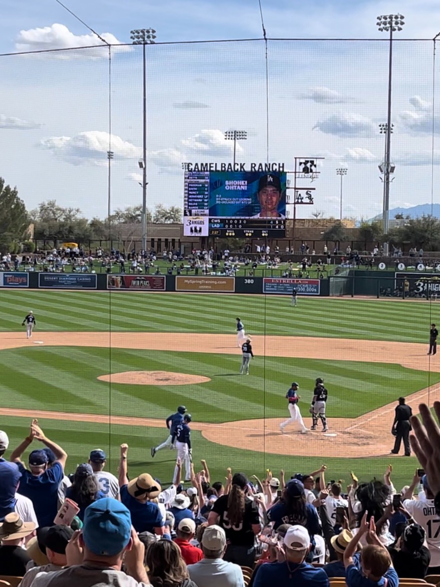この春休みが始まる前、大谷翔平が好きな台湾人の友達と野球の話をしていたら一緒に見に行くことになり、他の留学生を含めた五人でアリゾナ州に行きました。アリゾナ州はメキシコと隣り合わせの場所で、気候も暖かく綺麗な町でした。私たちが見た試合は、大谷翔平が新しいチームに移籍後、初めての試合でした。日本語で書かれた看板を持参している日本人や、大きなカメラを持ったNHKの取材陣もいました。アナウンスが大谷翔平と言うと、観客はどの選手よりも盛り上がっていました。試合では大谷翔平が初試合でホームランを打ち、会場は大盛り上がりでした。