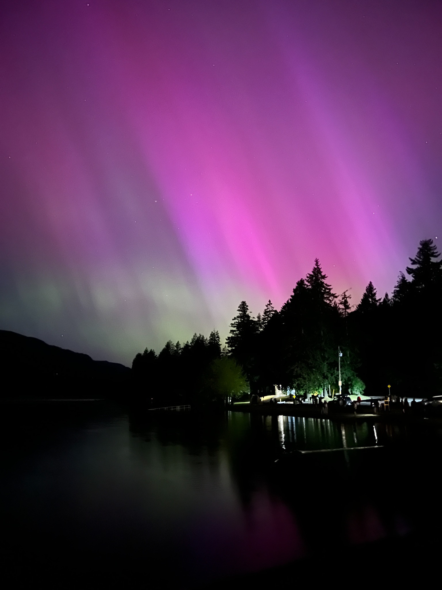 なんとしてでも見るしかありません。ということで、いつものメンバーでオーロラが観測できるであろう深夜まで学校に残り皆で光のカーテンを見ようということになりました。日が沈むまで課題をしたり、ジュースで乾杯しお喋りをしたりと楽しんでいたのですが中々オーロラは現れてくれず、各々が友人やSNSを通して状況をリサーチしていました。するとウェストウッドレイクパークに居る友人がオーロラを観測したと教えてくれたので脇目も振らずバスに乗り込み公園に向かいました。ワクワクが溢れ出ている我々はバスの運転手や乗客にオーロラを見た?と聞いたりと落ち着きを失っていました。バスを降りて高台にある公園まで向かっていると絵画のような光に彩られた空が目に入りました。息を呑むほど壮大なオーロラが夜空全体を覆っていました。大はしゃぎで公園まで行くと、レイクパークということで広大な湖とオーロラの融合を目の前で堪能することができました。大はしゃぎで写真を撮り感動と興奮と、この年・この日に留学としてカナダに訪れていたからこそ友人達とオーロラの光をこの目に焼きつけることができたのだという奇跡を何度も何度も噛み締めました。これまで頑張ってきた留学生活へのご褒美のような美しく幻想的で忘れられない思い出となる一夜でした。残り数週間の留学生活も余すことなく楽しみながら頑張ろうと改めて思います。