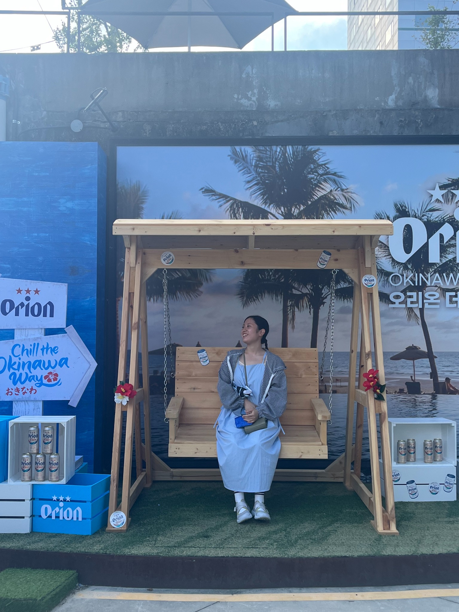 最後に、韓国でオリオンビールを飲んだことについてお話しします。韓国に来て約5ヶ月が過ぎ、私は、沖縄が恋しくなる時期になりました。その為、ソウルの聖水で開催中だった「オリオンビールのポップアップ」に行って来ました。そこでは、オリオンビールだけでなく沖縄の特産品、楽器などが揃っていました。また、私が沖縄から来たと定員さんに伝えるとすごく嬉しそうで、無料でさんぴん茶を貰うなど暖かさを感じました。さらに、私もウチナーグチ(沖縄の方言)を教えて、すごくいい経験ができました。この様に、日本の沖縄ではなく、世界の沖縄なのだと感じる1日でした。