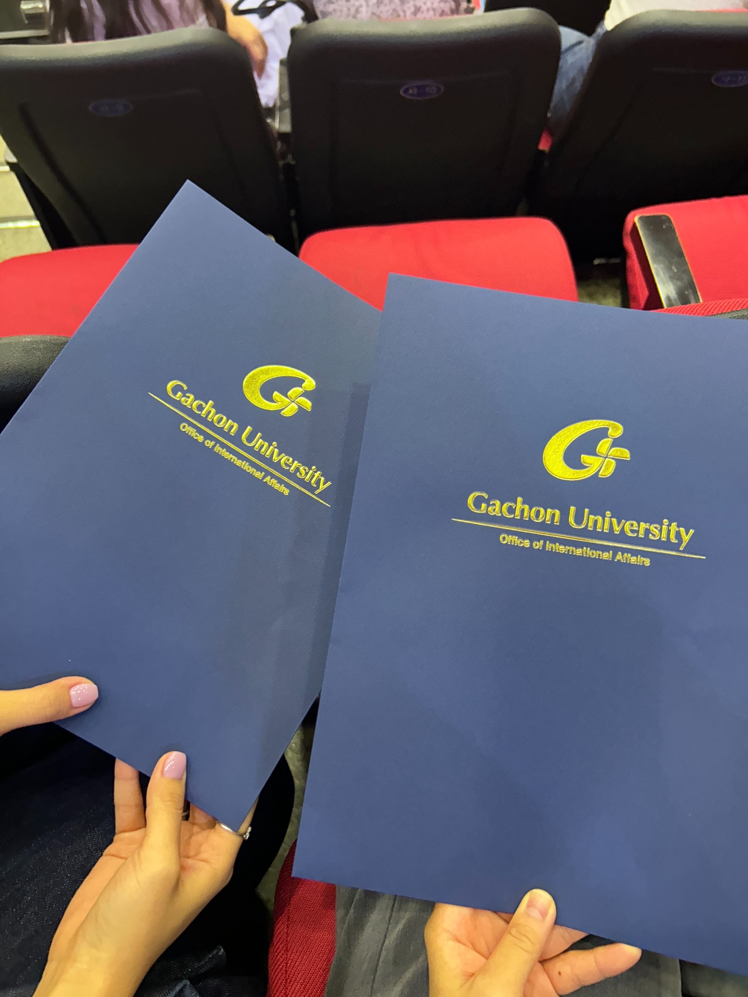 そして、期末テストが終わり2日後、語学堂夏学期修了式でした。嘉泉大学の語学堂では、夏学期と冬学期はコンサートホールで行います。私達は、修了式を行う事が初めてだったので緊張とワクワクが混ざった気持ちでした。修了式では、語学堂の生徒たちが特技を披露や韓国語でのスピーチ、優秀生徒の発表なども併せて行われます。修了式が終わり、成績表や記念品も渡され、すごく貴重な経験をしました。