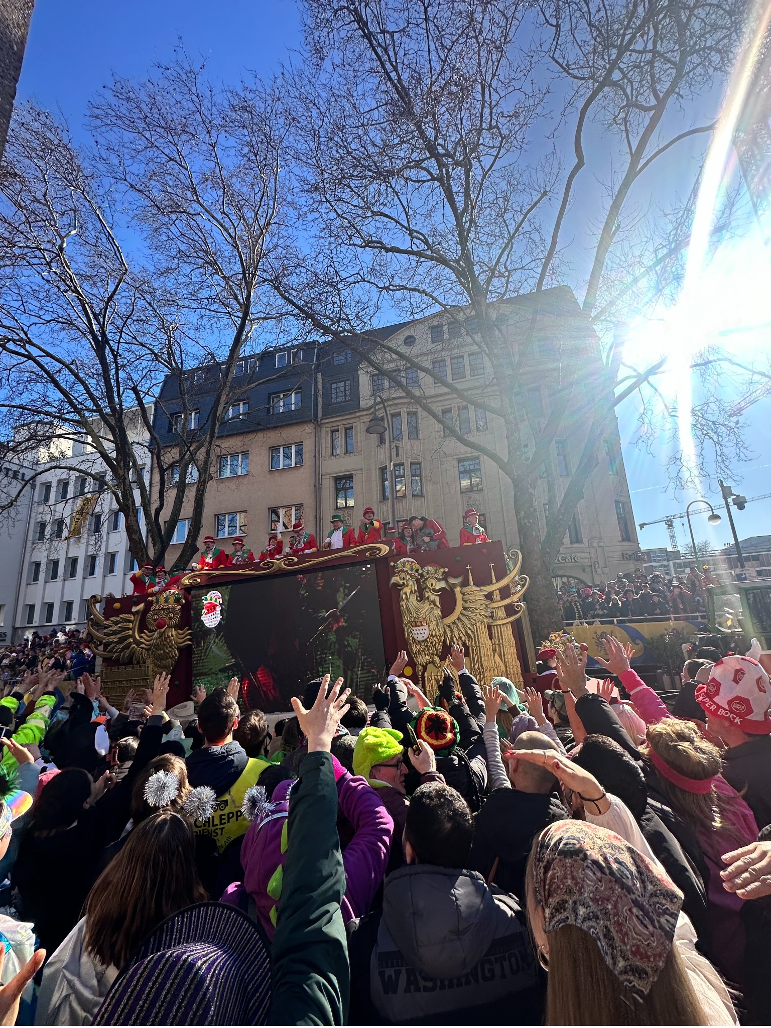 私はカーニバルパレードなどが行われるローゼンモンタークという日にケルンに行きました。パレードにいくとたくさんの人が仮装していました。また、パレードには華やかな山車や風刺的な山車が登場し、政治家などをユーモラスに描くのが定番です。また、パレードでは、お菓子が観客に向かって投げられます。私もいつくか取ることができました。